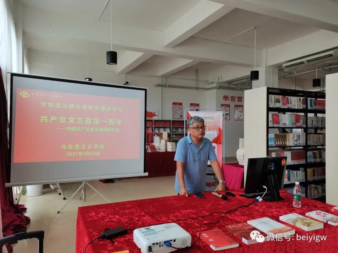 在全党如火如荼地开展党史学习教育之际,2021年5月28日下午,马克思主义学院组织全体党员、教师,在学校图书馆党史阅读角开展思想政治理论课教师理论学习暨党史学习专题党课活动,由马克思主义学院罗喜江教授作题为《共产党文艺政策一百年——中共文艺政策的形成》的党史知识培训。
