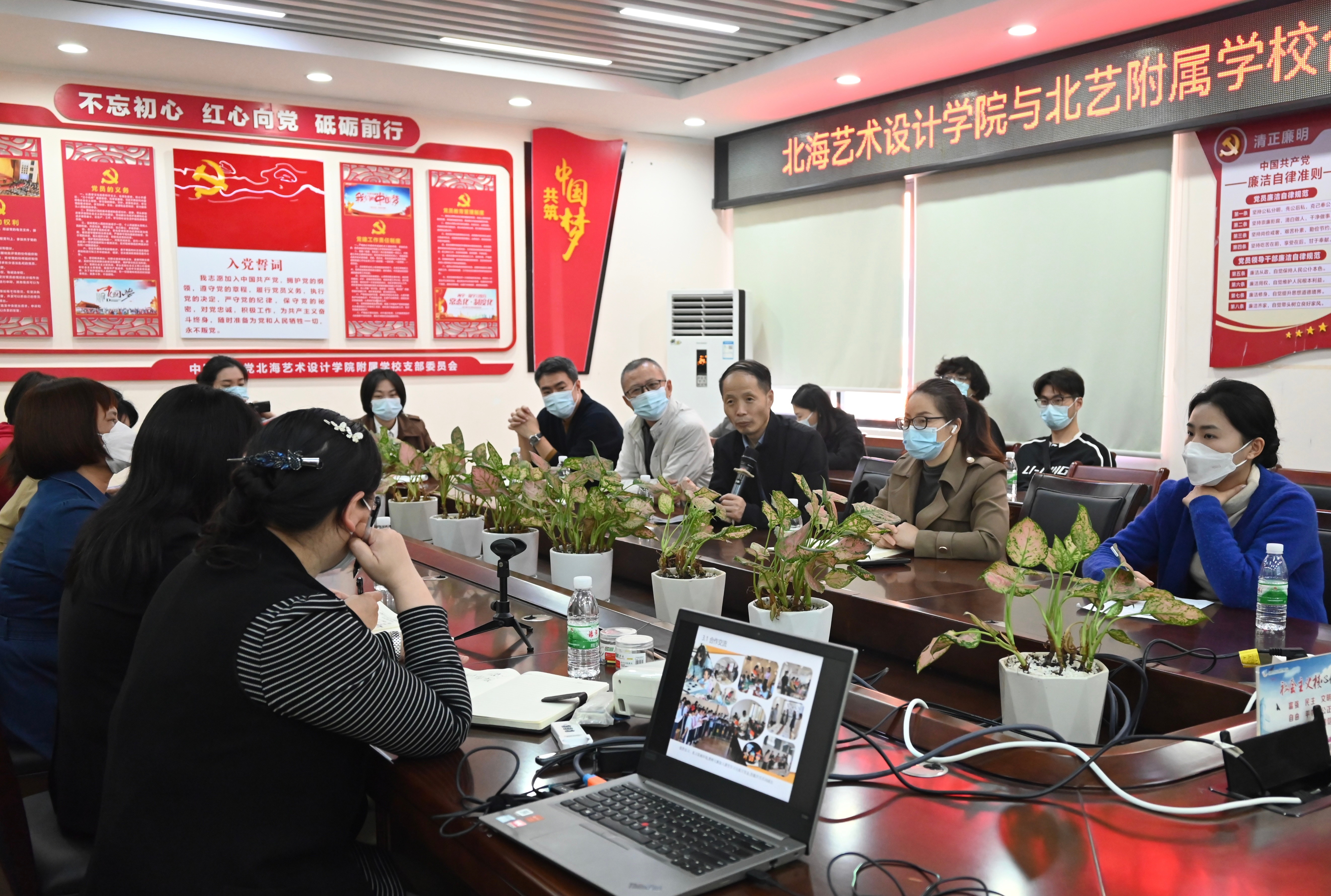 座谈会议由包玉红校长主持。会上,包校长介绍了学校师资、与北艺的合作历程、合作交流、合作课程、合作特色、合作参赛、办学成果等情况。双方围绕教学改革、学生实习实践、人才培养等方面的合作开展情况进行了深入的交流,重点对附校的“艺养教育”取得的长足进步,双方均给予高度评价。特别是由艺术教育专业的师生与附校师生共同建设的童声合唱团,为附校在市级、区级、国家级比赛中多次斩获荣誉,进一步提升了附校在社会上的影响力,现已成为家长口中的“金字招牌”,进一步提升了附校的综合实力,并在家长的口碑相传中扩大了附校的知名度和社会影响力。包校长希望未来两校可以继续加深产教融合,扩大合作领域,加强校校共建,进一步推进教学改革,取得更多的教学成果。