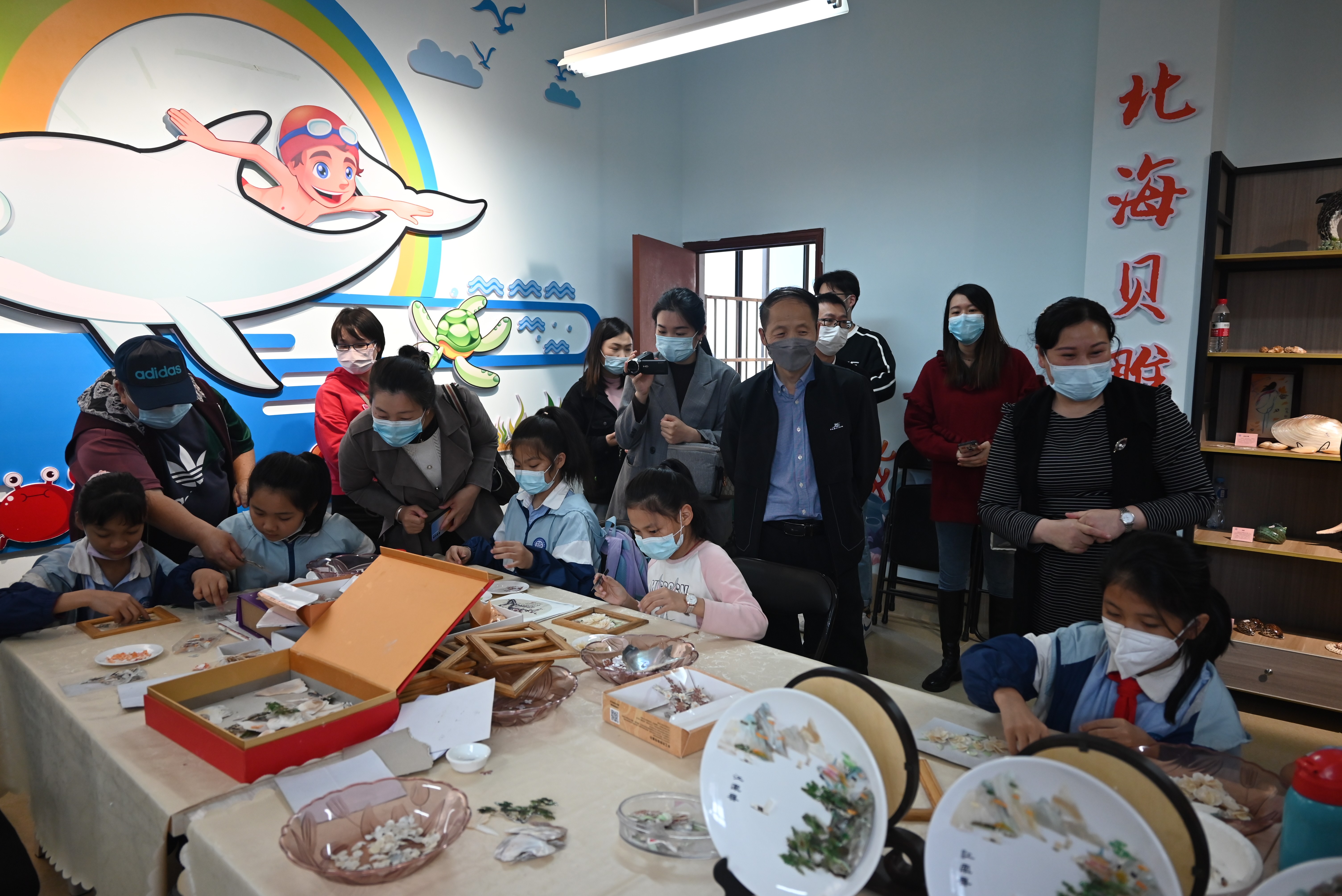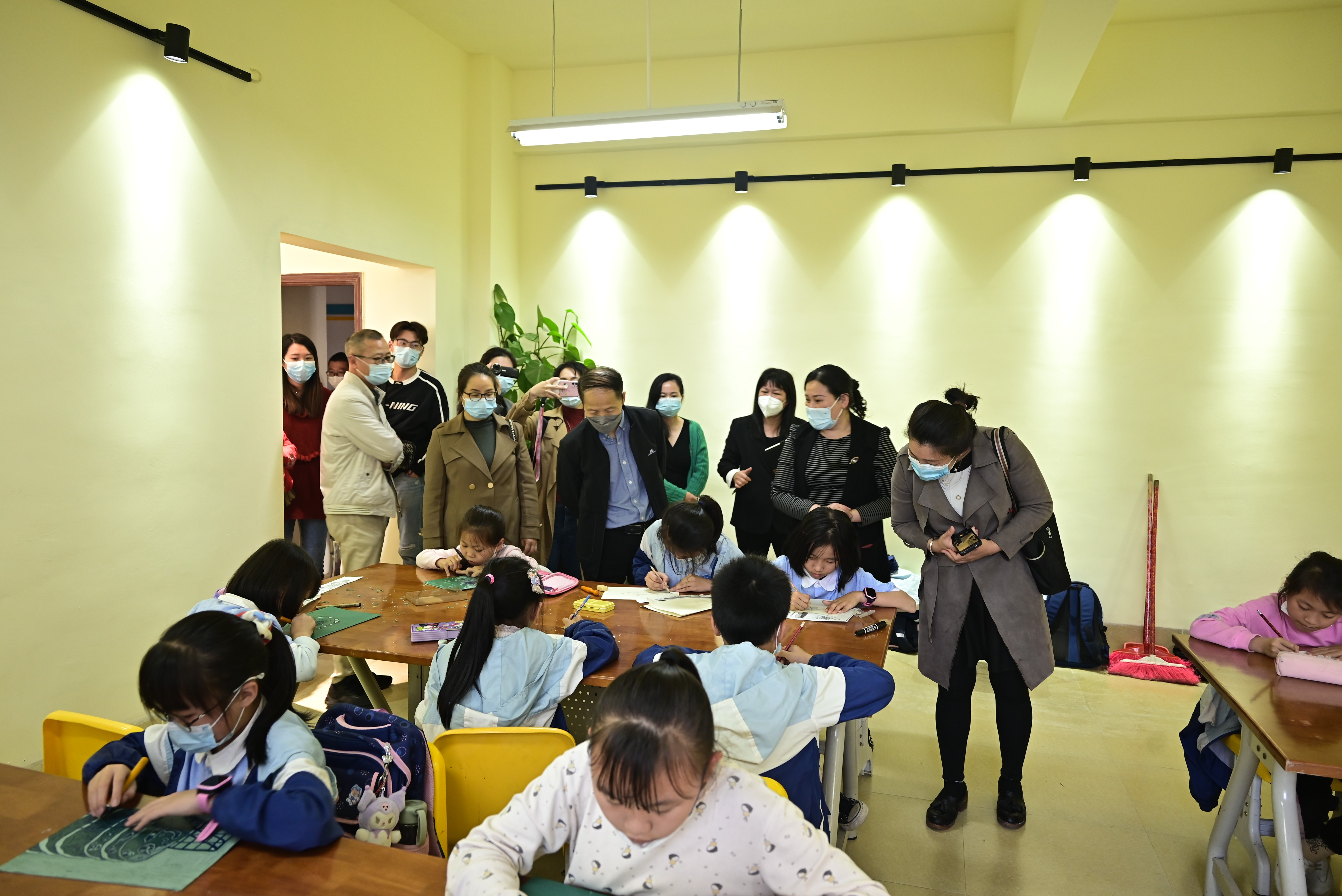 会后,包校长带领郭教授及考察团队一行人进入合唱、舞蹈、非遗贝雕传习、版画与书法的课堂进行实时走访考察。走访中,包校长带领大家到艺术教育专业的毕业实习生的 美术课堂,并向考察组详细介绍了实习生的工作安排管理,对实习生的工作能力给予了充分肯定。