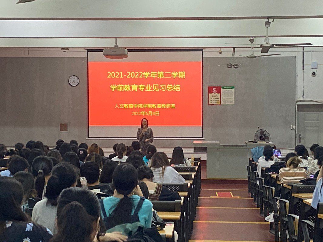 教育见习结束后,学前教育教研室于6月8日晚组织学生召开2021-2022学年第二学期学前教育专业见习总结会。总结会上,学前2002学生乔阳代表全体教育见习同学发言,乔阳同学围绕本次教育见习谈了收获和体会。冯小霞老师对本次教育见习进行总结肯定了同学们表现指出不足,勉励同学们改正不足,争取更大的进步。学前教育教研室副主任蒙剑英老师发表讲话,希望同学们针对本次教育见习认真做好总结,对标合格幼儿教师,查找差距,完善自身,争取早日以合格幼儿教师的身份在走上岗位 (照片:学前教研室