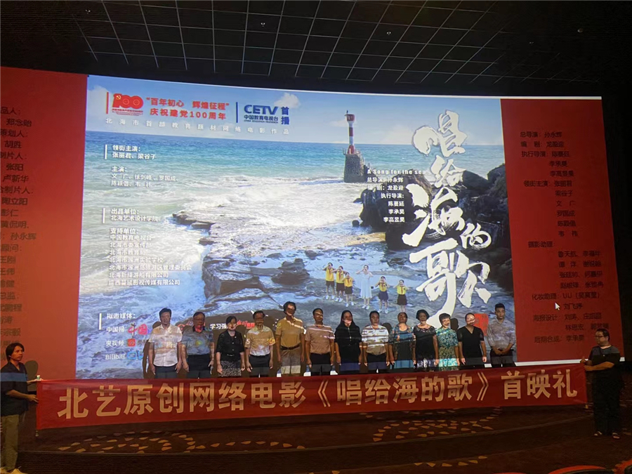 2021年6月30日下午,由北海艺术设计学院出品的建党100周年献礼片暨首部教育题材电影《唱给海的歌》首映仪式在北海万达影城举行。首映式由全国城市十佳金牌主播,北海广播电视台新闻主播李鎏主持,北海市委宣传部副部长、市新闻出版局局长陈言启,市教育局党组书记、副局长李祥吉,北海广播电视台台长、总编辑高峰,北海新绎游船有限公司党委书记杜启菊,北海旅游集团有限公司经营部负责人王啸,北海老城文化旅游投资有限公司副总经理韩宇廓,北海市电子信息行业协会副会长庞伟东,南宁师范大学梁谷子教授,桂林电子科技大学北海校区葛俊杰院长,学校党委书记张阳,校长卢新华等领导,及广西各高校专家学者、社会各行业代表、电影主创团队和北艺师生一同欣赏了这部诚意之作并为首映启幕。