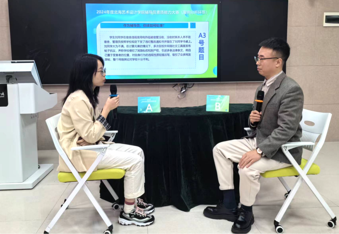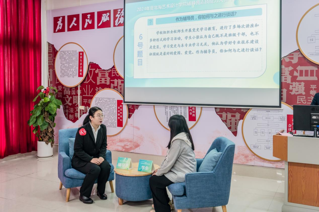 为全面贯彻落实全国高校思想政治工作会议和习近平总书记关于高校思想政治工作的系列重要论述精神,推动学生思想政治工作高质量发展,不断提升我校辅导员的理论水平、职业能力和专业素养,我校于2024年2月18日—3月15日举办了2024年度北海艺术设计学院辅导员素质能力大赛。此次比赛对标省赛赛制并结合学校具体工作实际,共设置基础知识测试、案例研讨、谈心谈话三个环节。第一轮基础知识测试结束后,共有12位选手成功进入案例研讨、谈心谈话环节。