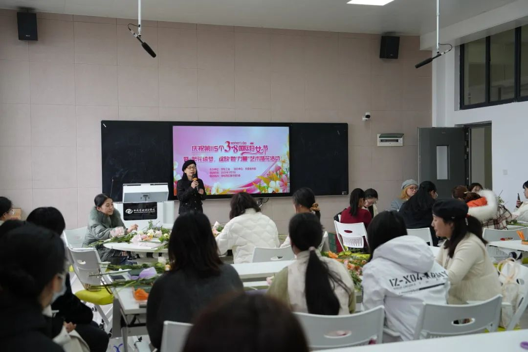 活动伊始,陈毅华副书记代表学校向全体女同胞致以节日问候。她表示,女性教职工是推动学校高质量发展的“半边天”,在担任照顾家庭、教养子女的母性角色的同时,也在教书育人、管理服务等社会岗位上展现坚韧智慧与独特魅力。她鼓励大家以此次插花艺术活动为契机,体验和谐的搭配与优雅的平衡,感受艺术之美、生活之趣,暂时放下工作与生活的繁重负担,涵养身心、凝聚力量。最后,她祝福广大女同胞芳华永驻,爱自己、爱生活。