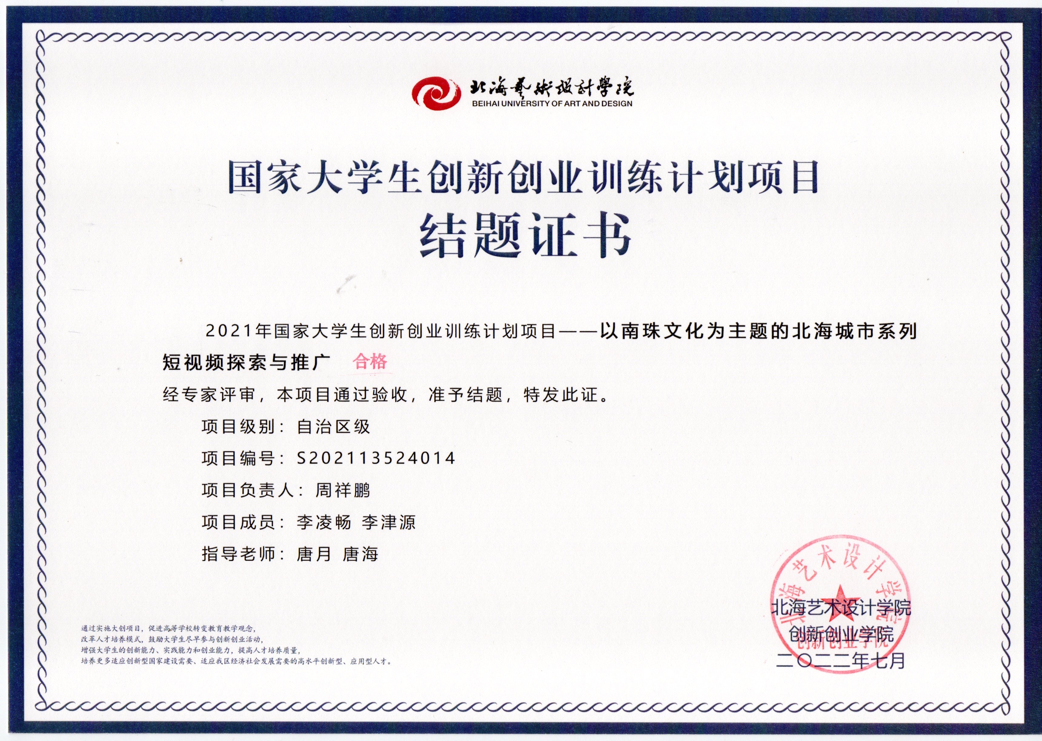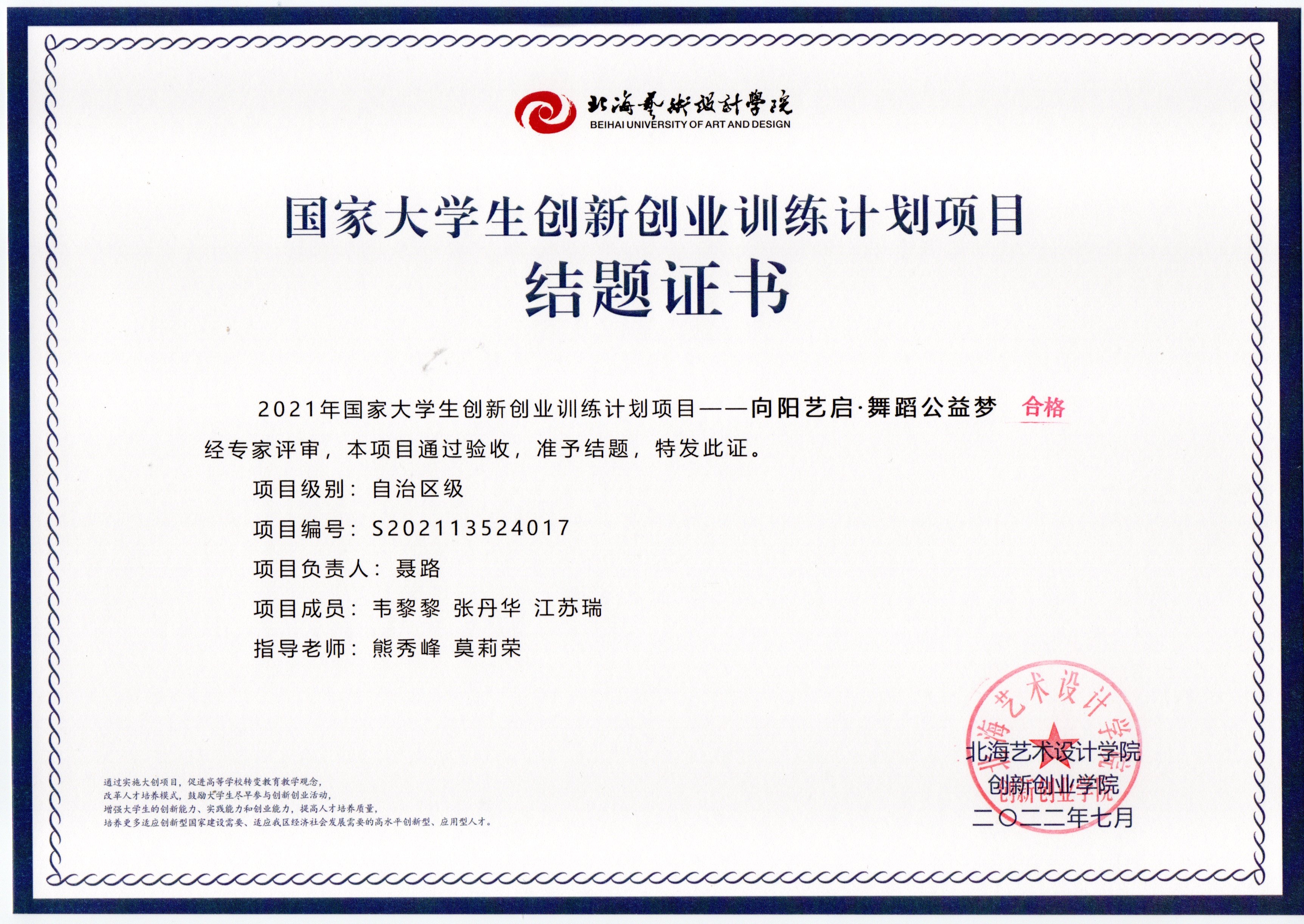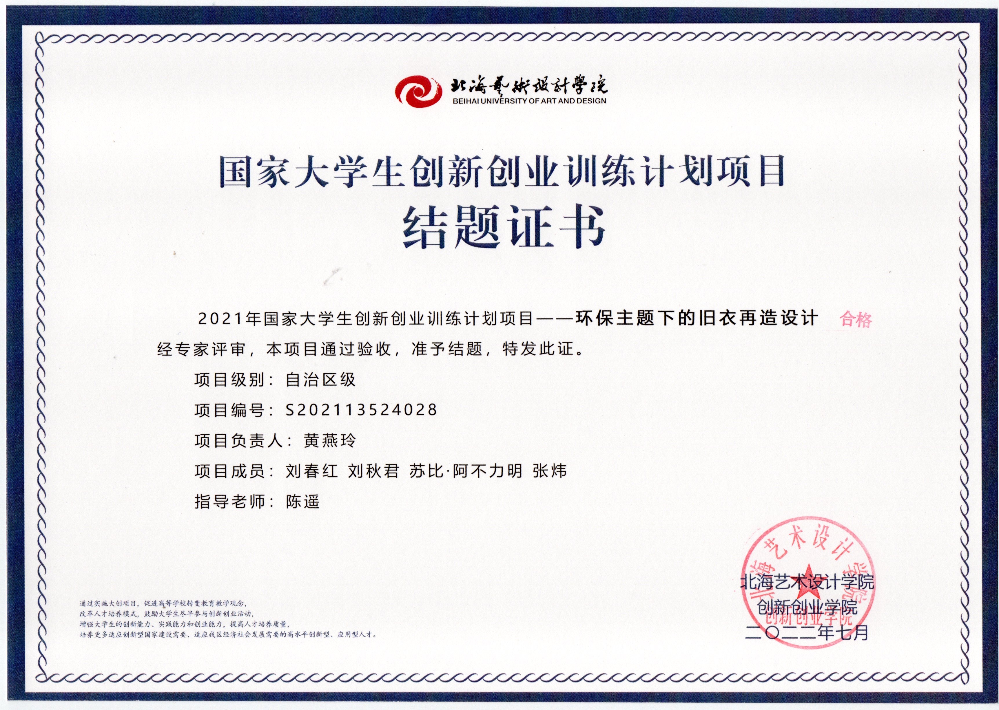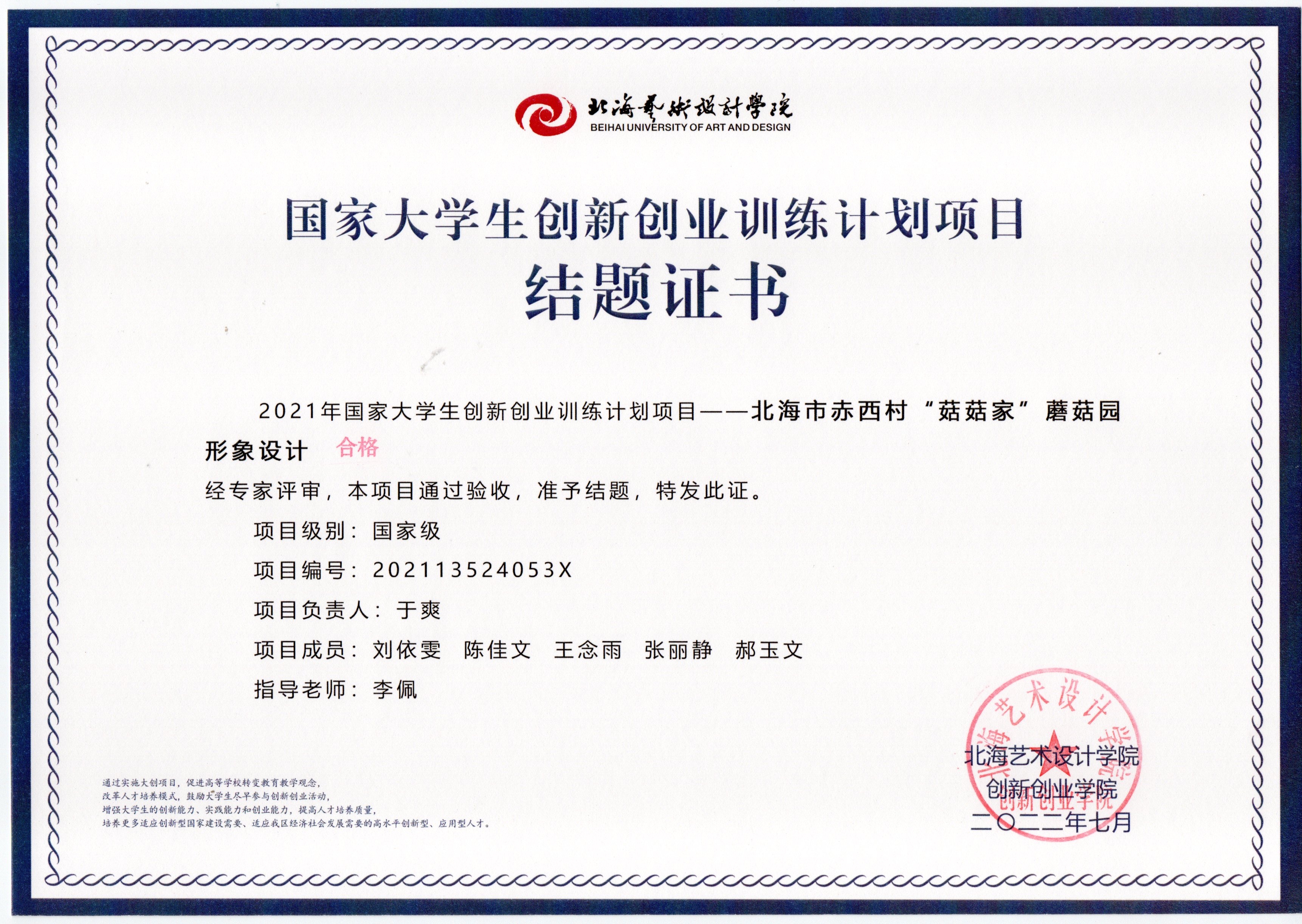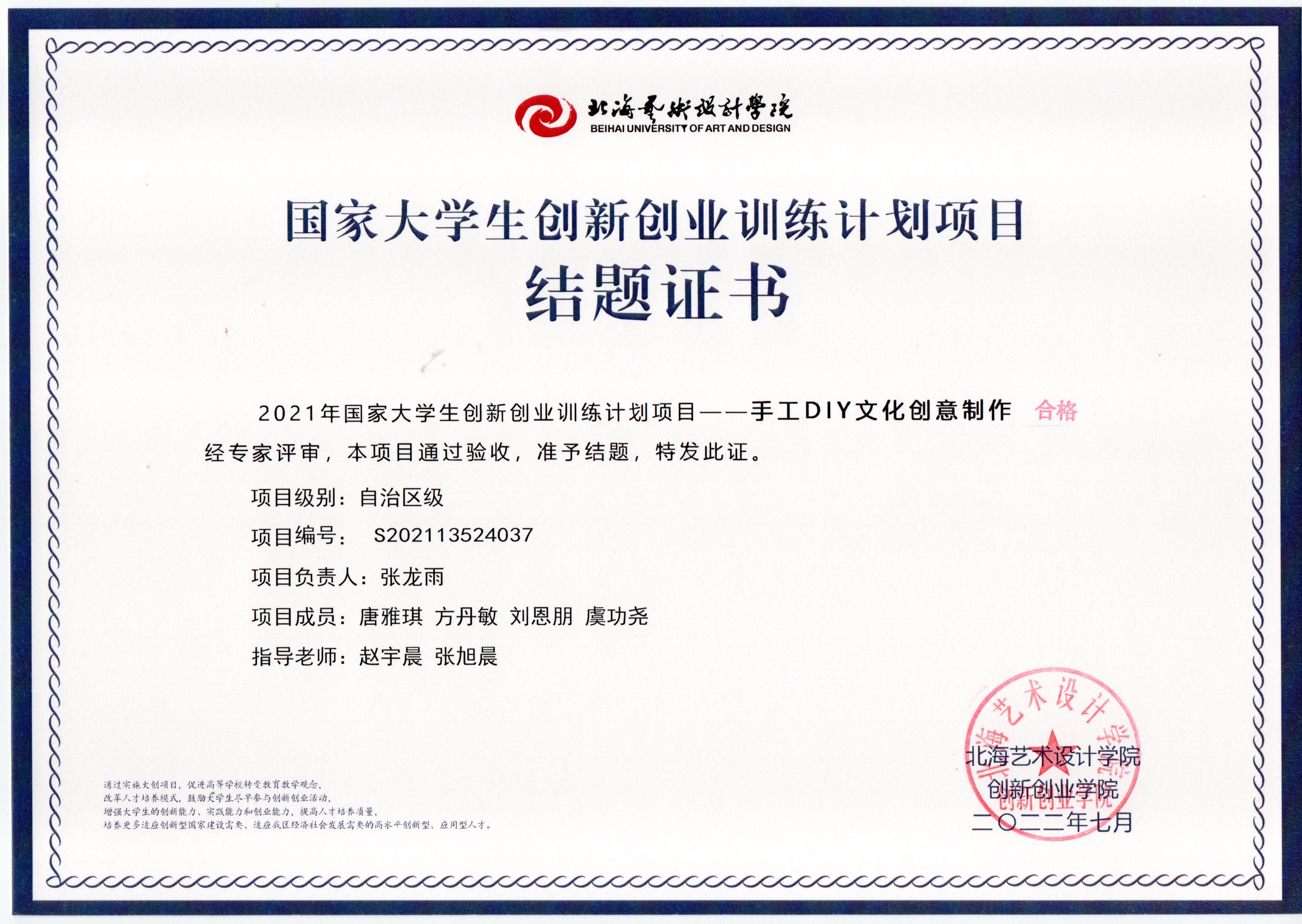 2022年大创项目结题证书(2021立项)