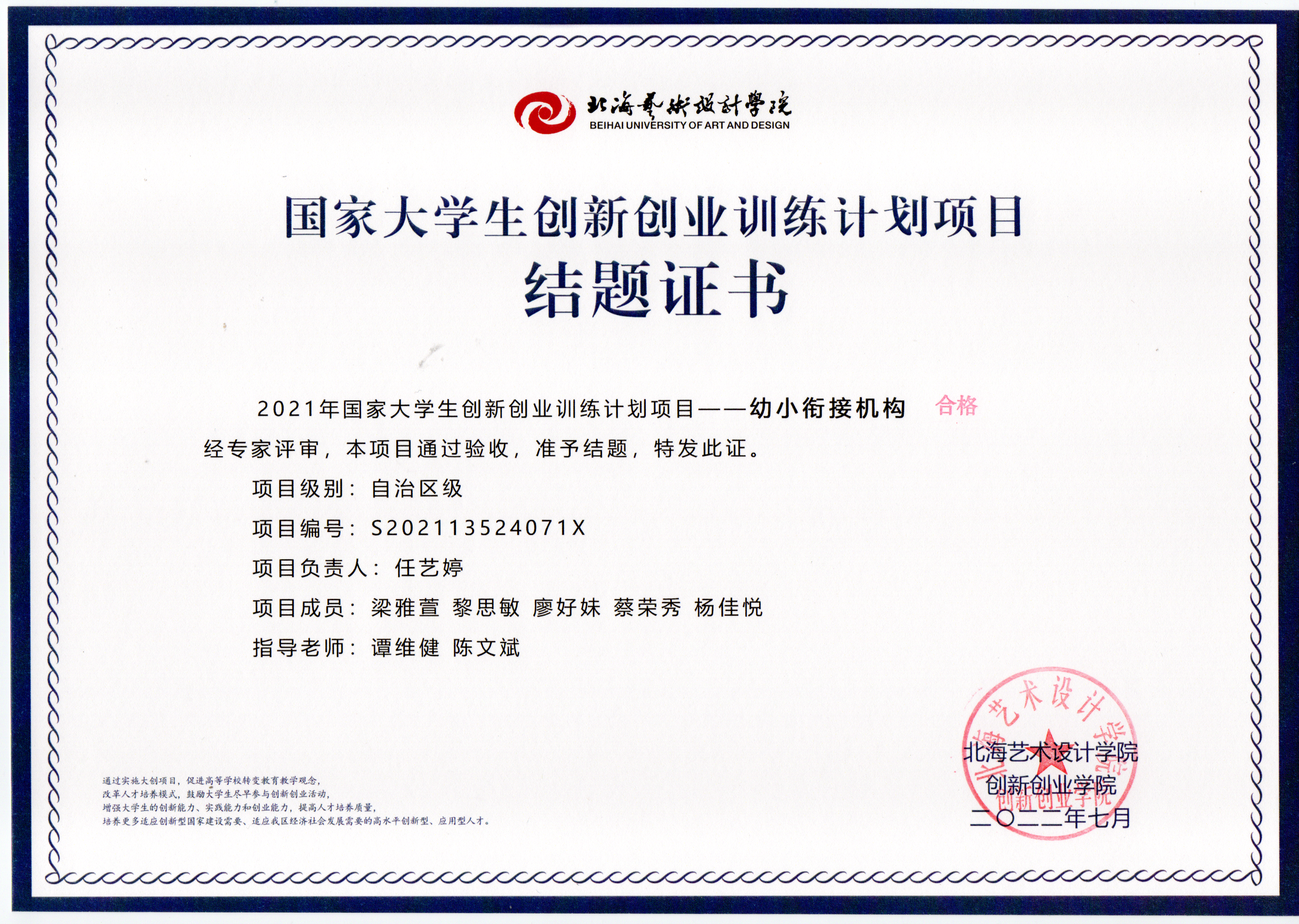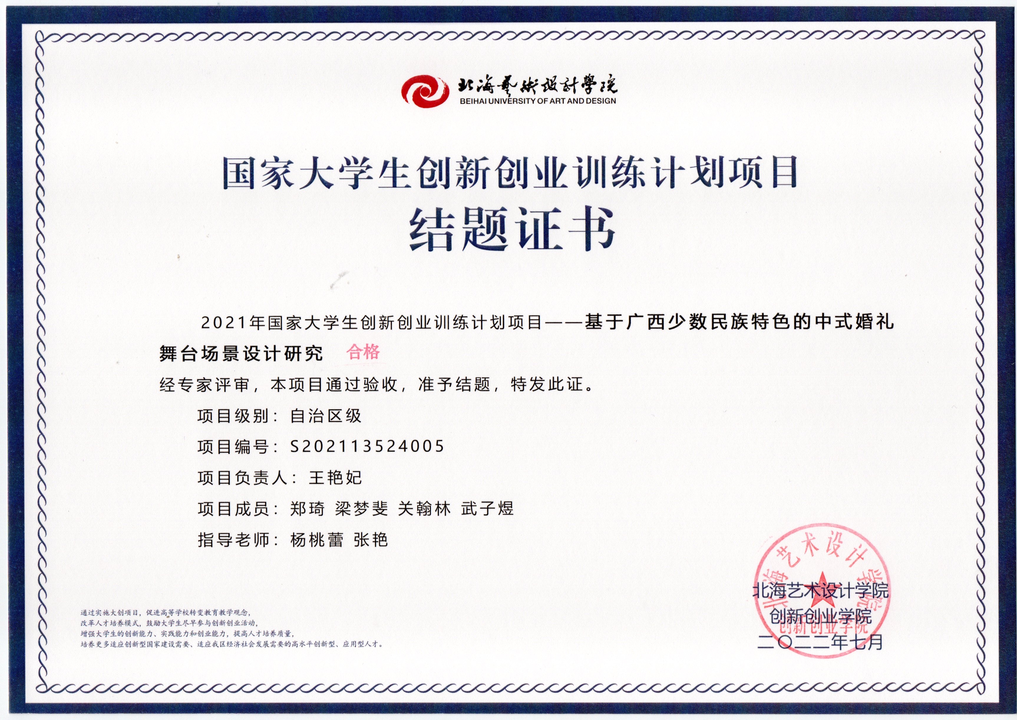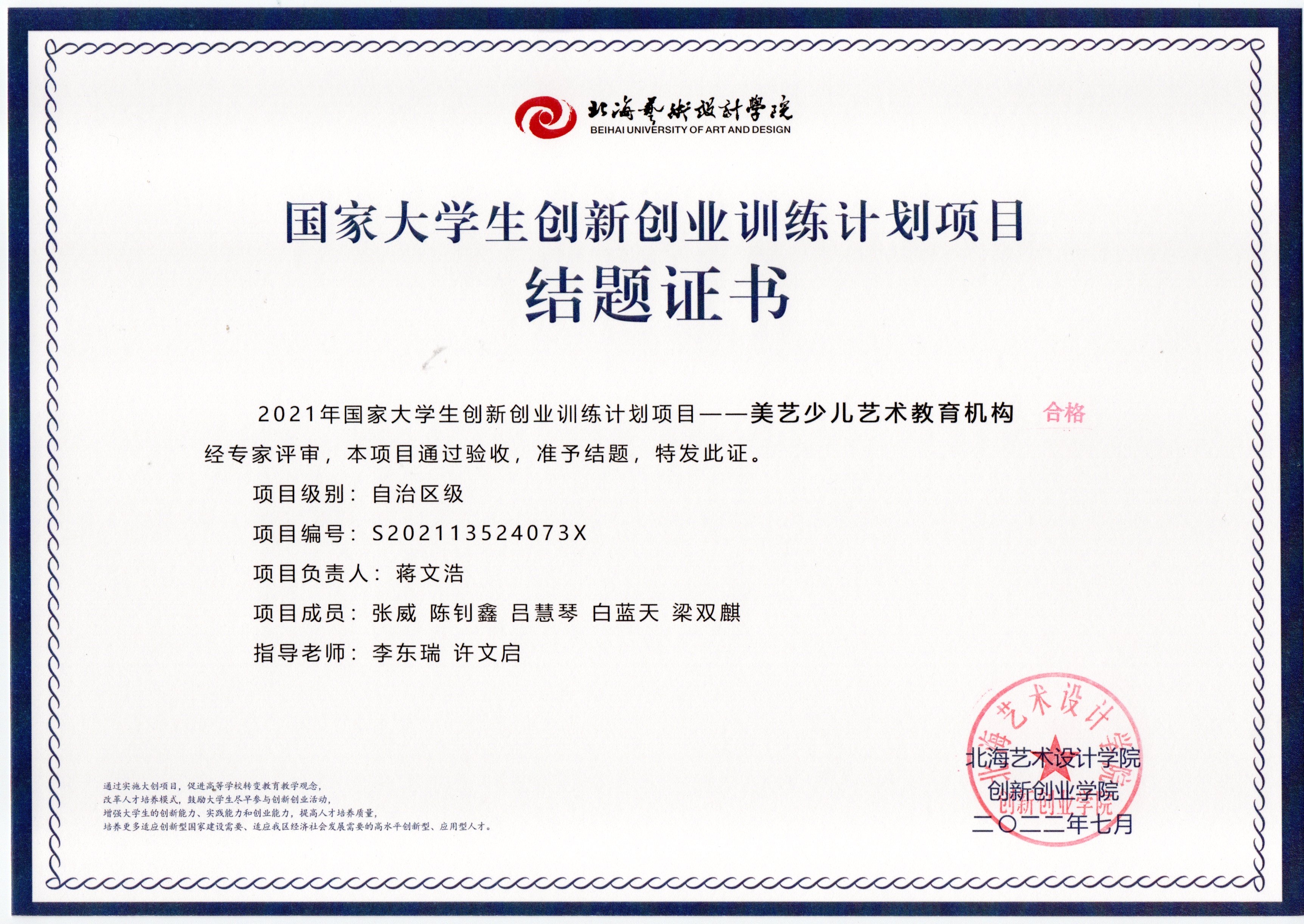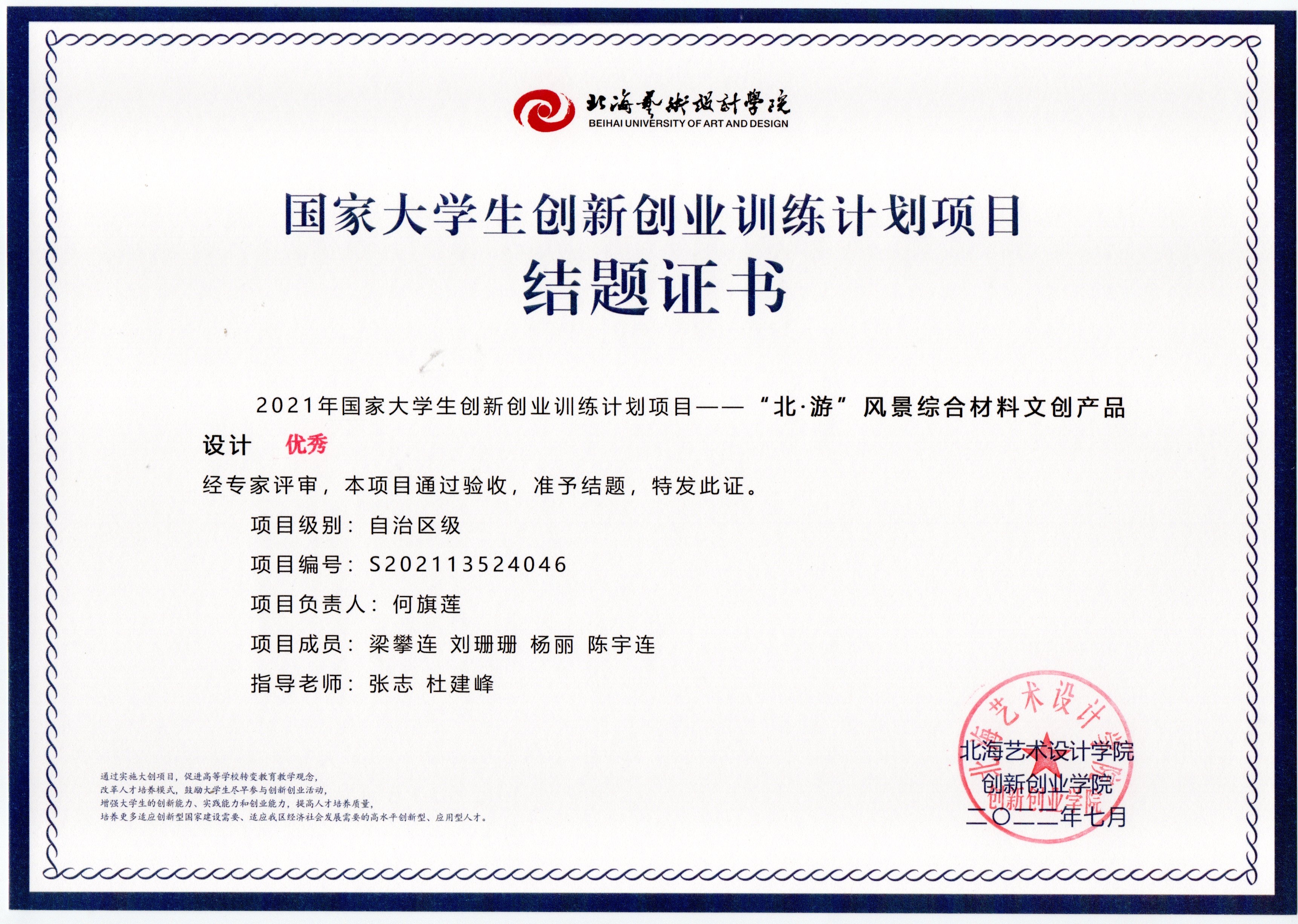 2022年大创项目结题证书(2021立项)