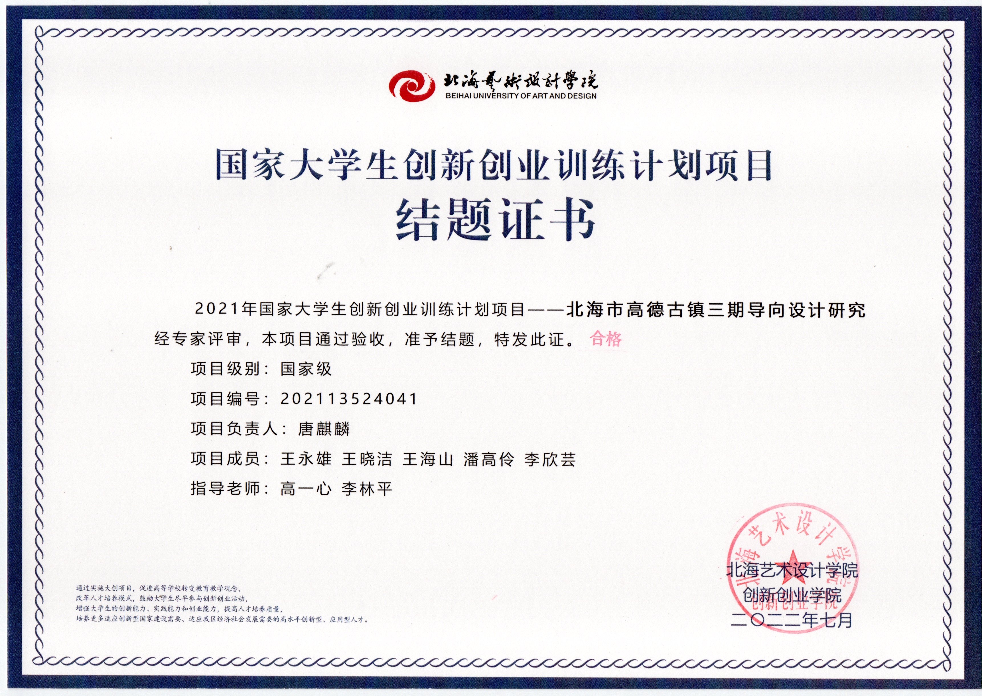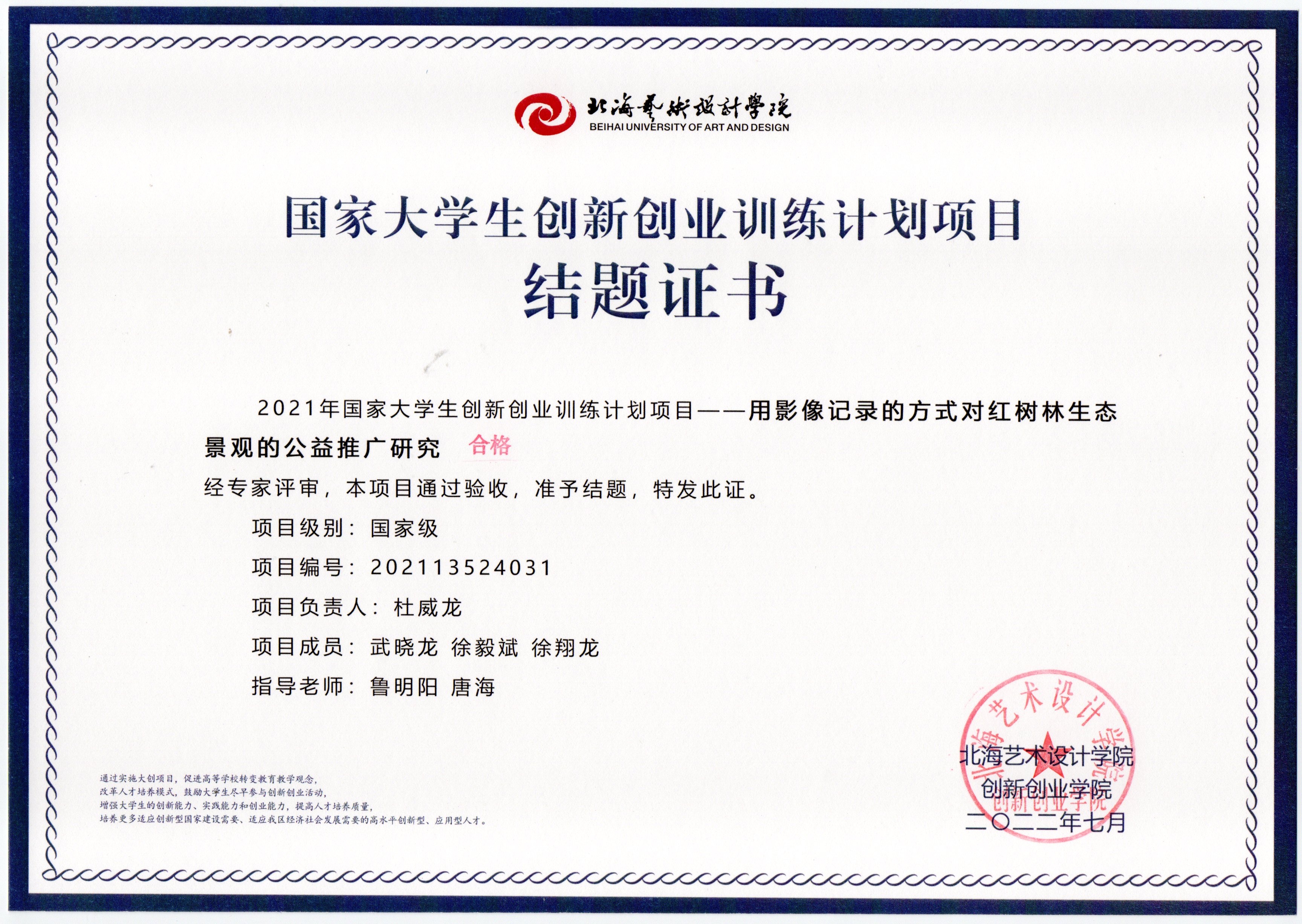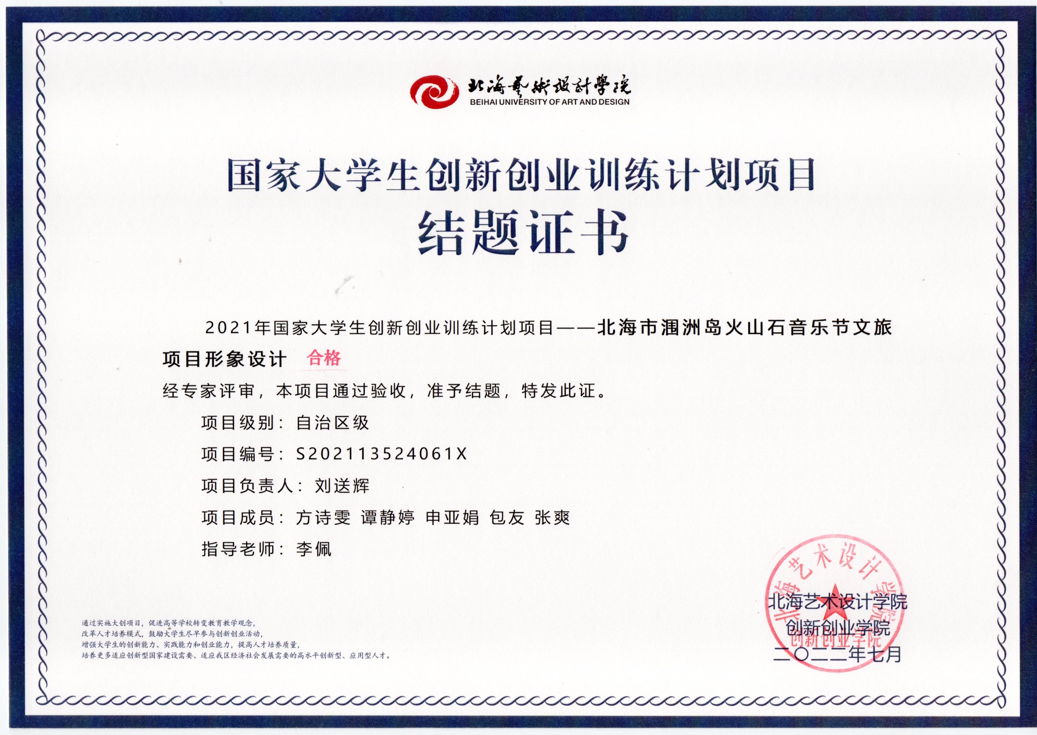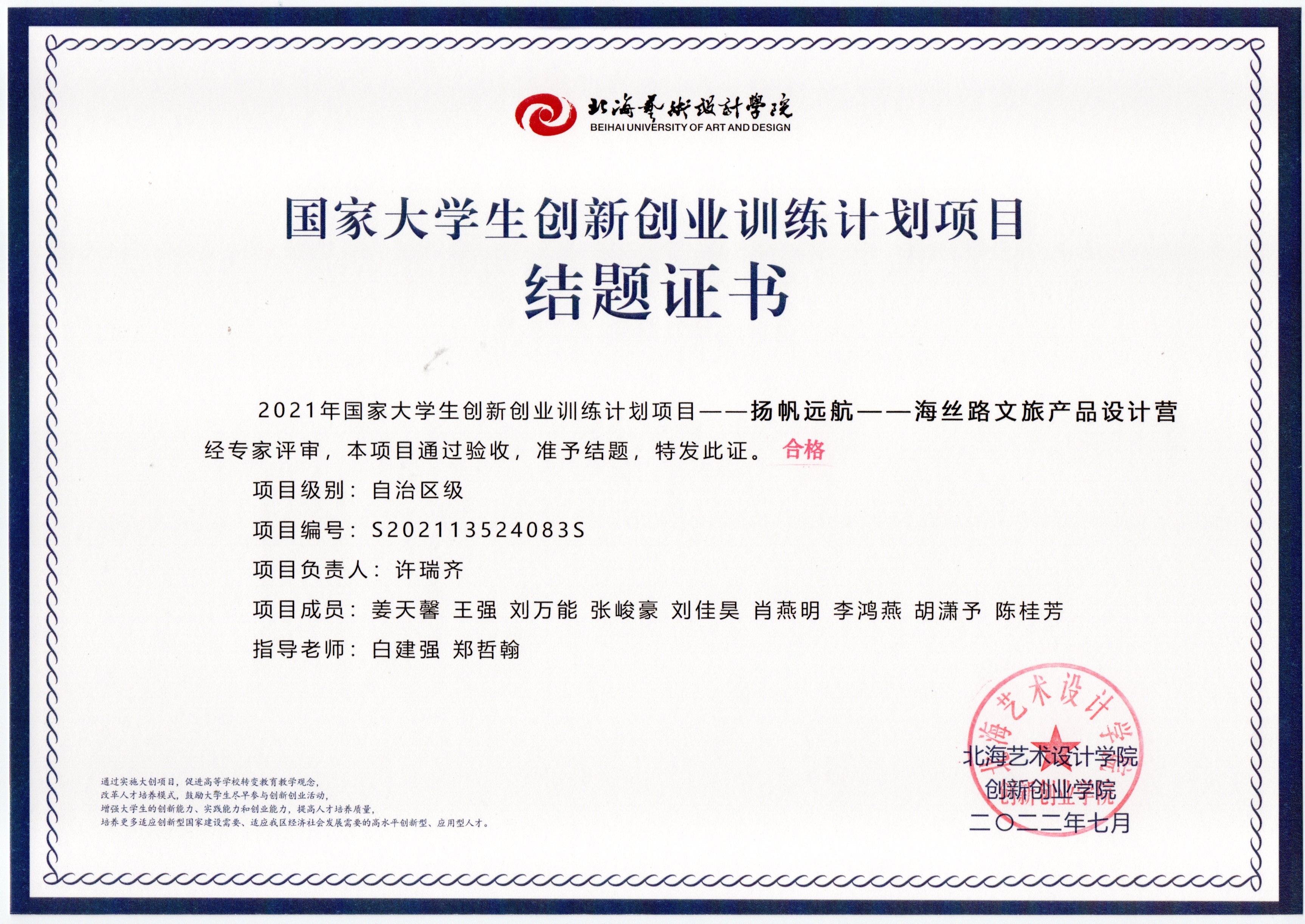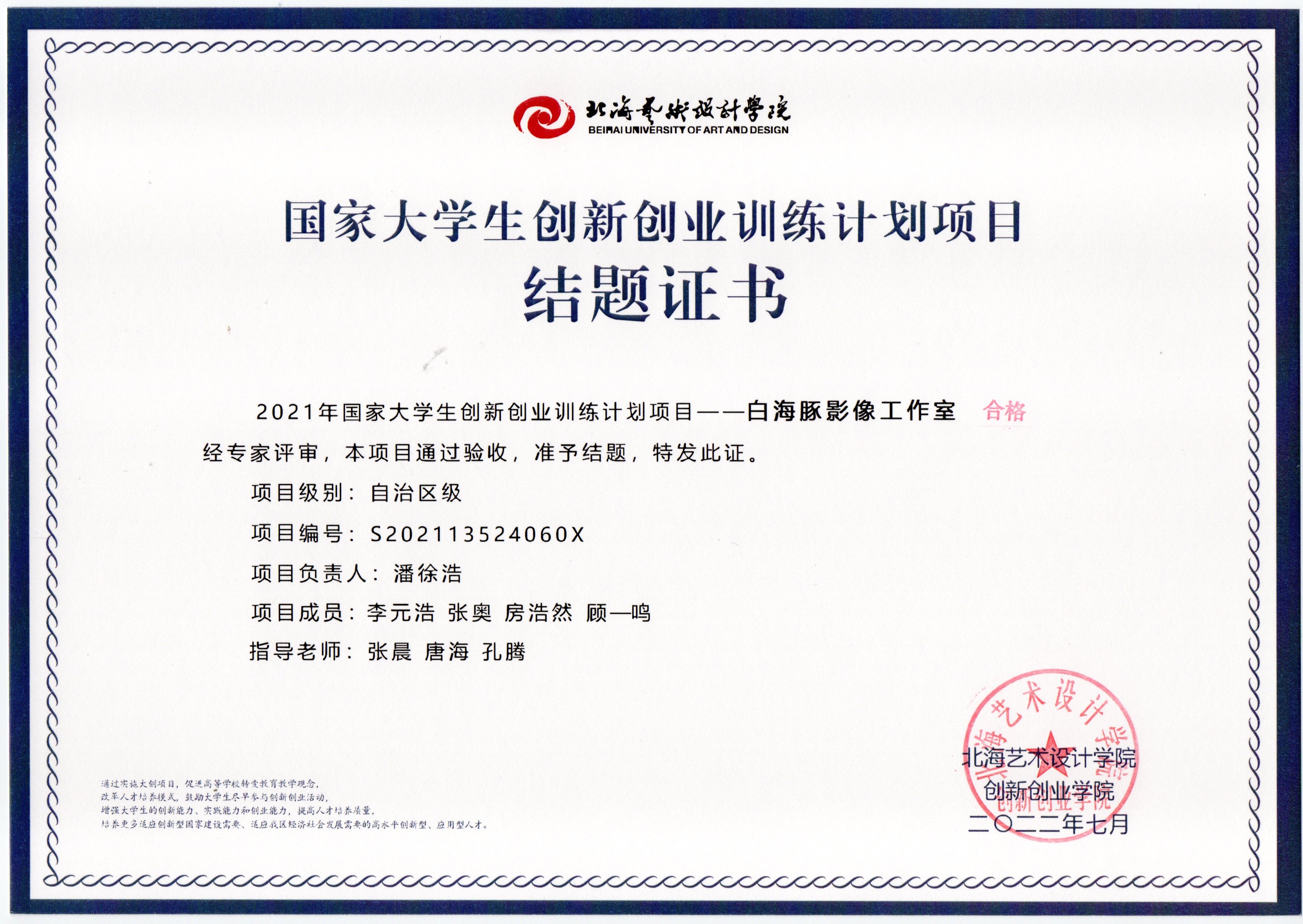 2022年大创项目结题证书(2021立项)