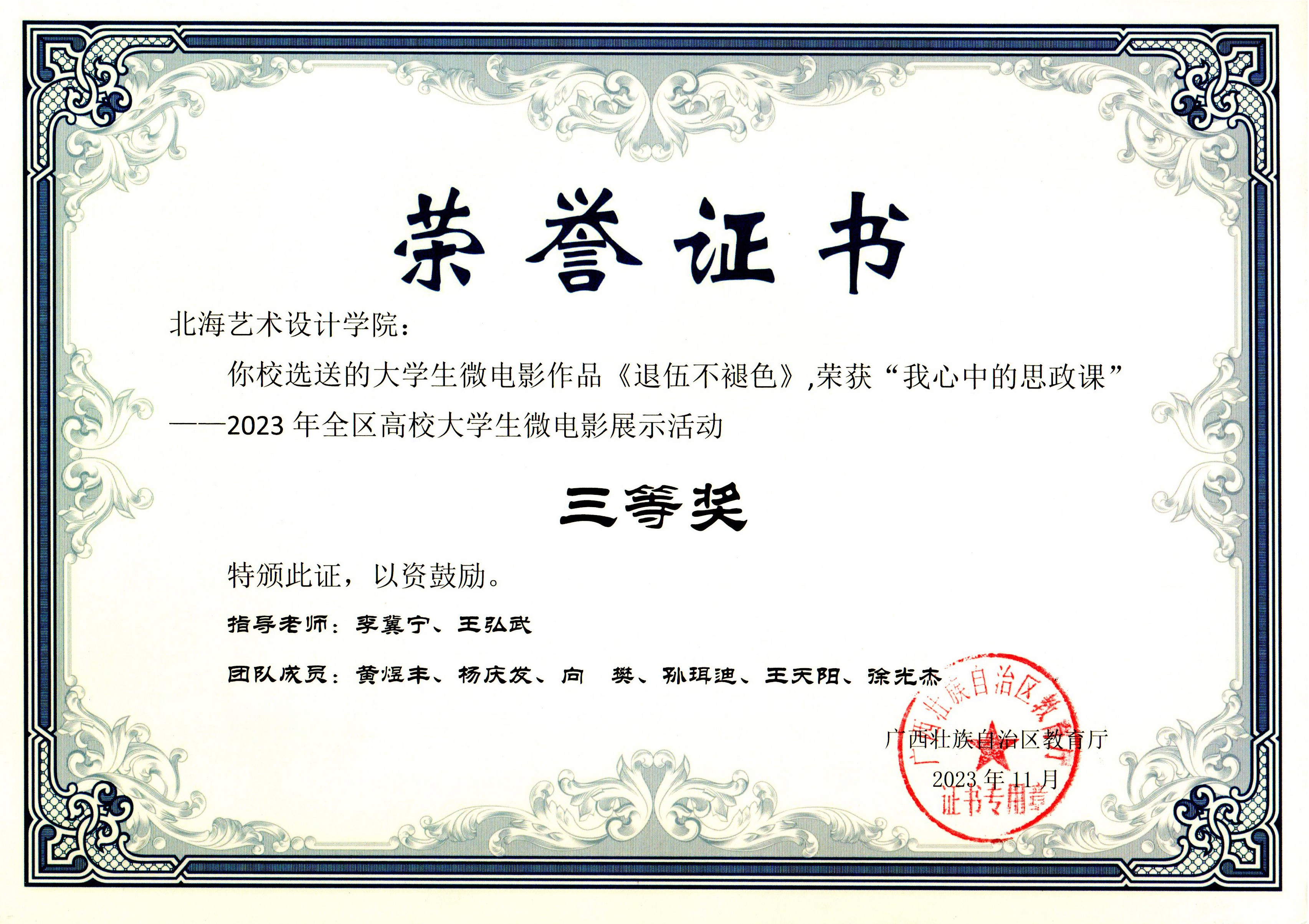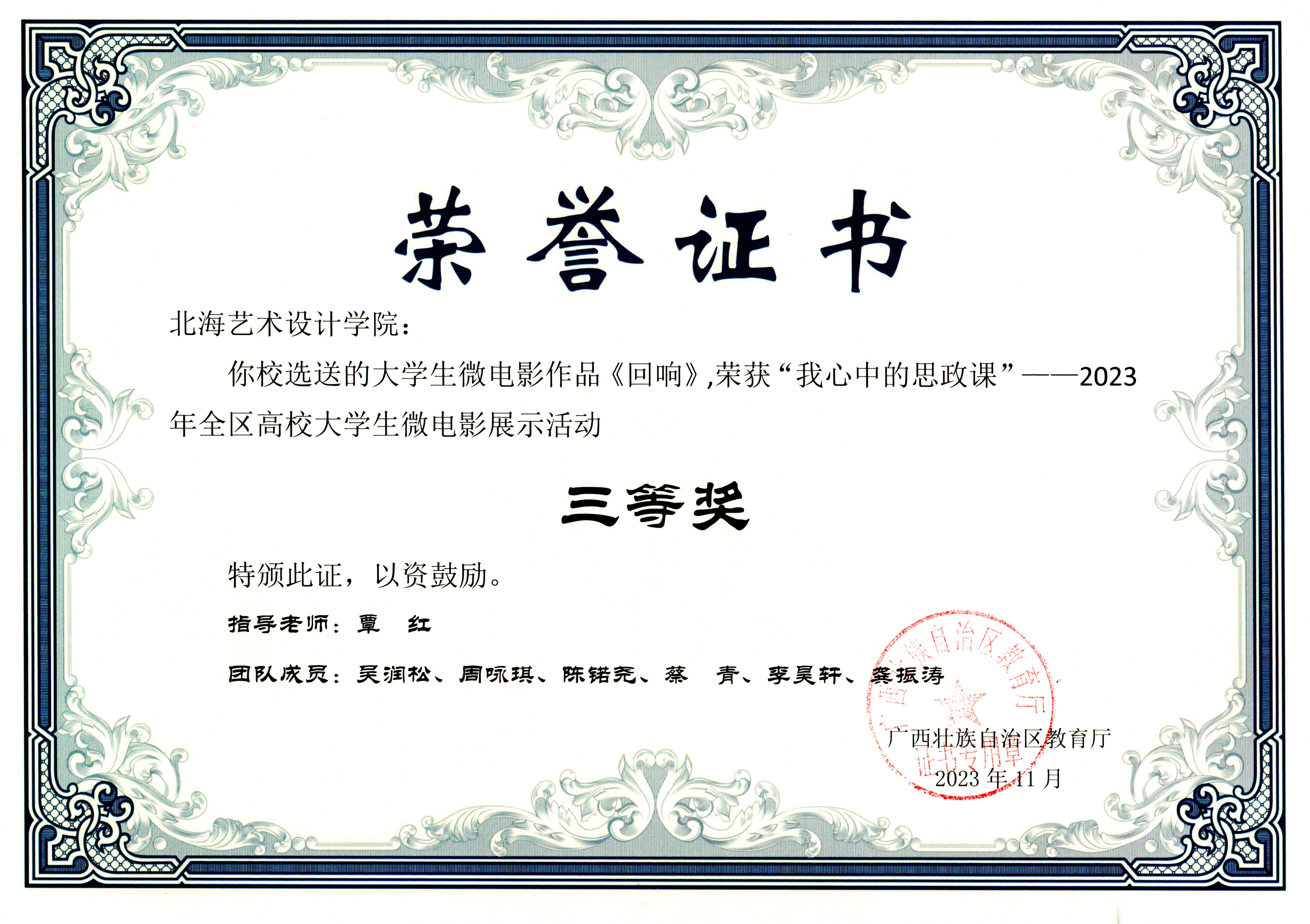喜报:大学生微电影作品《回响》《如愿》《退伍不褪色》均荣获“我心中的思政课“——2023年全区高校大学生微电影展示活动三等奖