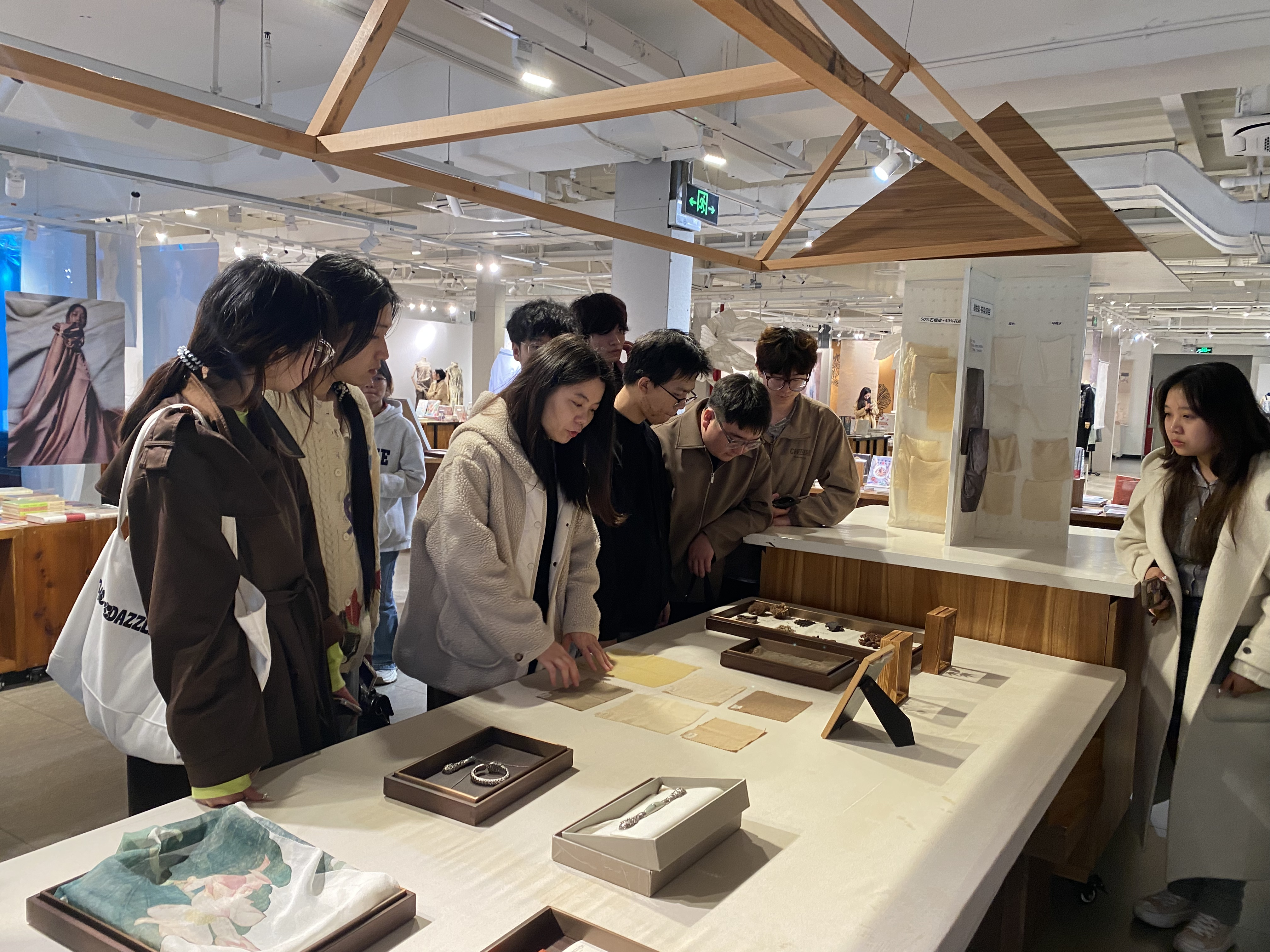 最后一站,服装学院调研师生走进例外品牌公司。作为中国原创设计的标杆,例外将手工刺绣、植物染色等非遗技艺与现代科技结合,打造兼具东方美学与国际审美的服装。其陈列空间以书籍、古董柜等元素烘托文化氛围,颠覆传统卖场逻辑,令学生深刻感受到品牌对文化传承与创新的执着。