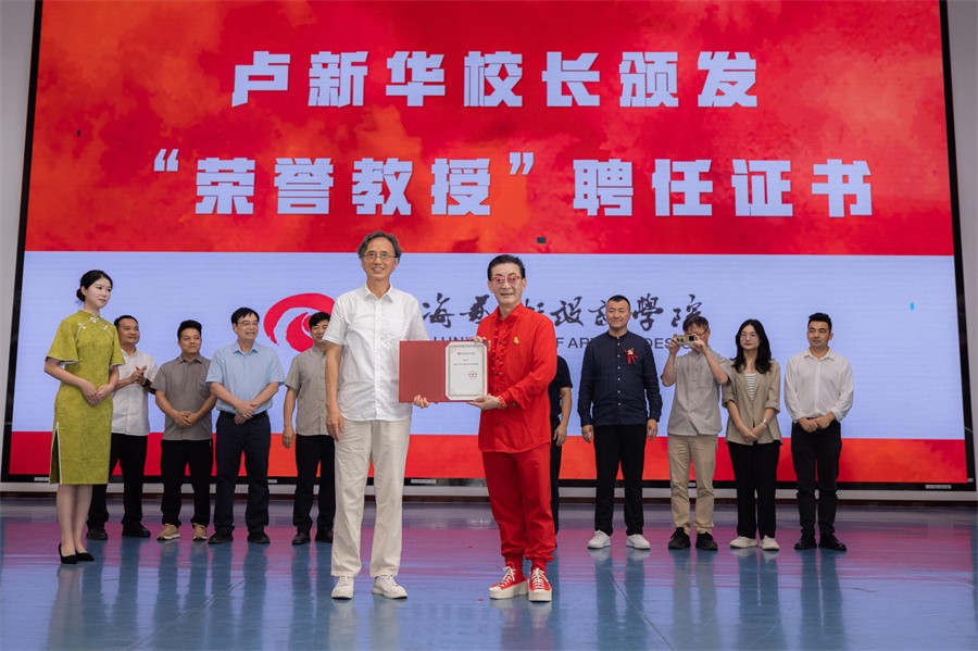 卢新华校长为六小龄童颁发荣誉教授聘书