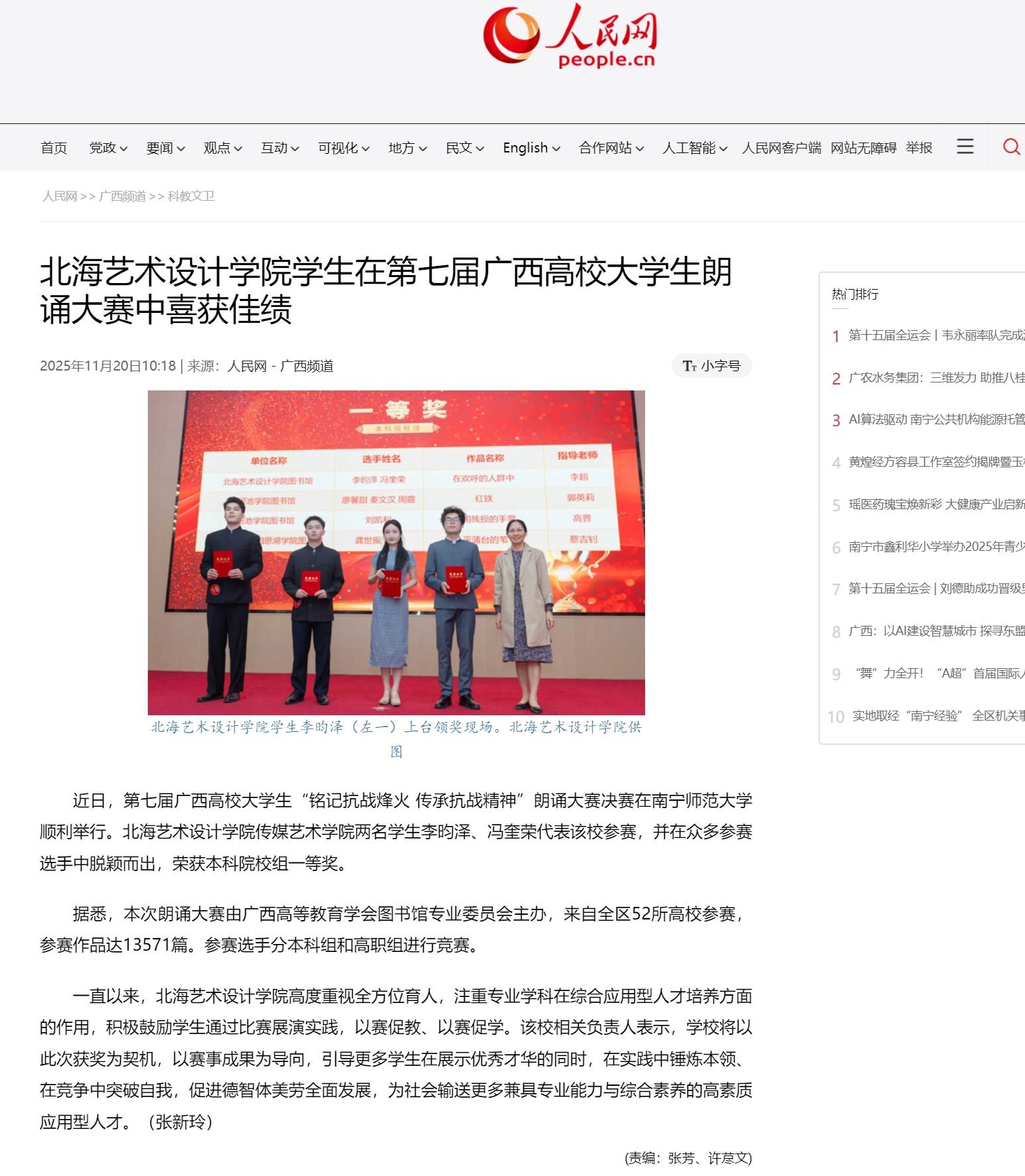 人民网:北海艺术设计学院学生在第七届广西高校大学生朗诵大赛中喜获佳绩