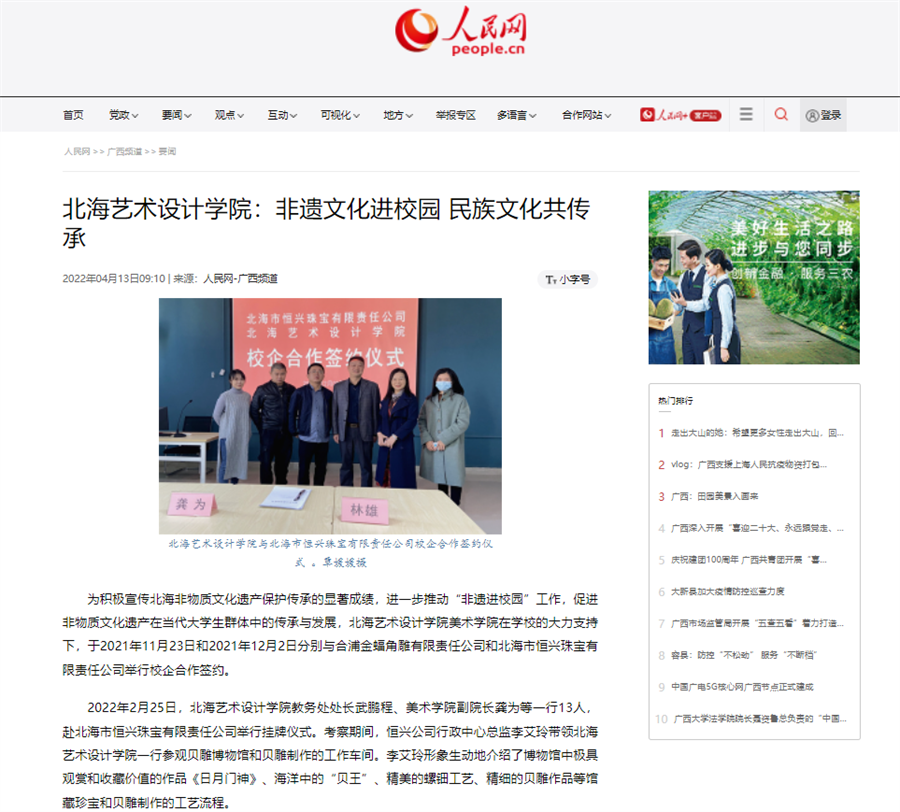 4月13日,人民网以《北海艺术设计学院:非遗文化进校园 民族文化共传承》为题,报道我校关于非遗文化进校园,传承民族文化的相关校企合作。美术学院不断加强与校外企业合作,共同创建横向课题,积极开展产教融合教学,培养服务国家和地方行业需求的专业高素质应用型人才。