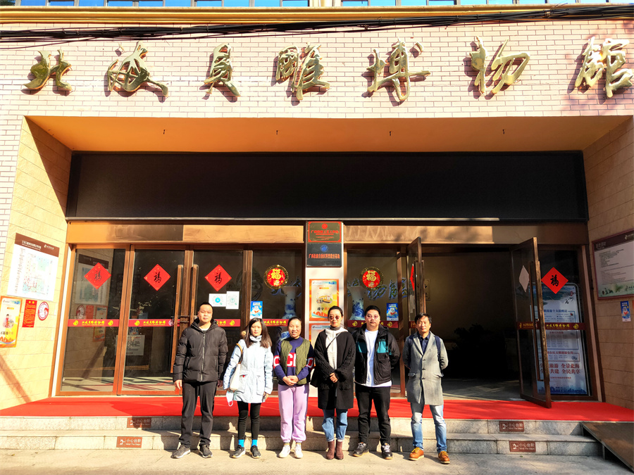2022年2月25日,北海艺术设计学院教务处处长武鹏程、美术学院副院长龚为等一行13人,赴北海市恒兴珠宝有限责任公司举行挂牌仪式。考察期间,恒兴公司行政中心总监李艾玲带领北海艺术设计学院一行参观贝雕博物馆和贝雕制作的工作车间。李艾玲形象生动地介绍了博物馆中极具观赏和收藏价值的作品《日月门神》、海洋中的“贝王”、精美的螺钿工艺、精细的贝雕作品等馆藏珍宝和贝雕制作的工艺流程。