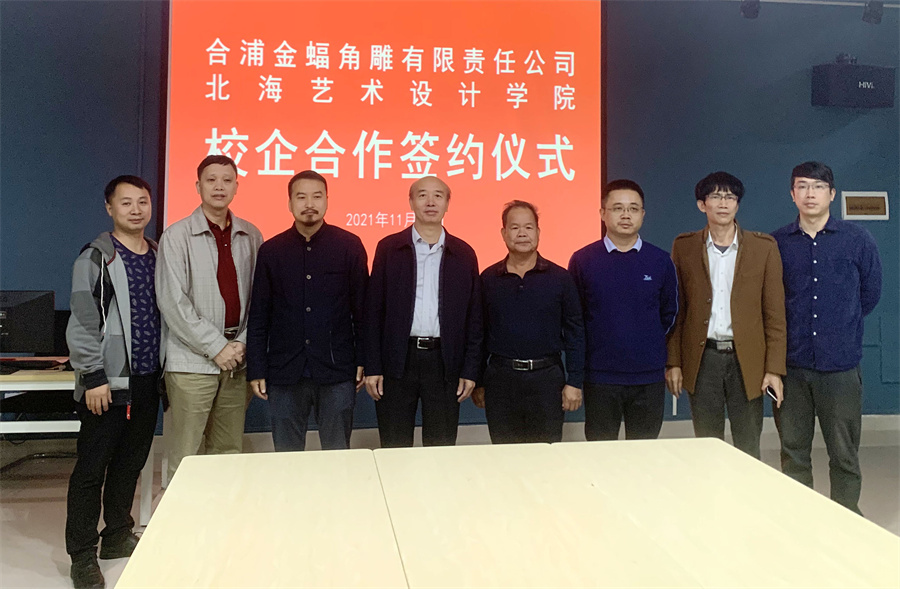 为积极宣传北海非物质文化遗产保护传承的显著成绩,进一步推动“非遗进校园”工作,促进非物质文化遗产在当代大学生群体中的传承与发展,北海艺术设计学院美术学院在学校的大力支持下,于2021年11月23日和2021年12月2日分别与合浦金蝠角雕有限责任公司和北海市恒兴珠宝有限责任公司举行校企合作签约。