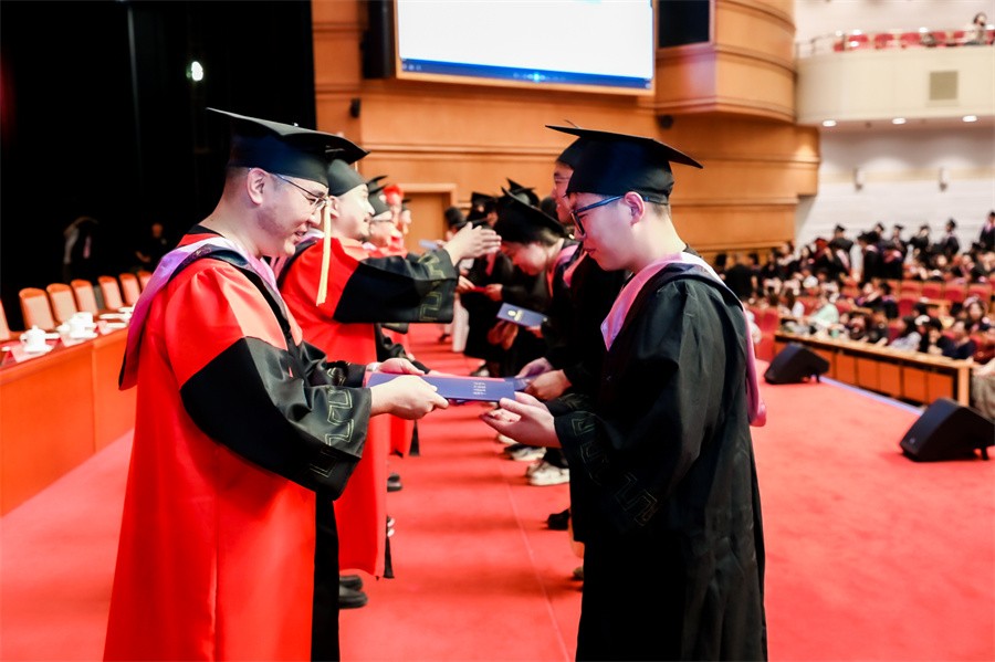 典礼上,学校学位评定委员会委员为毕业生代表颁发毕业证书和学位证书并一一拨穗正冠,合影留念。岁月悠悠,师恩难忘,情谊长存;学子毕业礼成,满怀激动,感恩师恩,怀揣梦想,斗志昂扬。