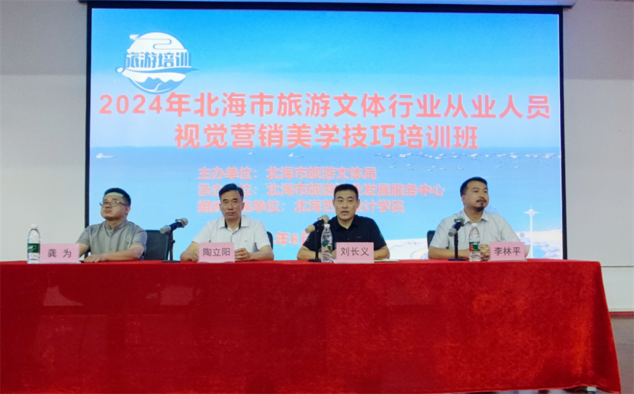 6月19日-20日,为期两天的2024年北海市旅游文体行业从业人员视觉营销美学技巧培训班在我校举办。市旅游文体局副局长刘长义,我校副校长陶立阳、设计艺术学院院长李林平、美术学院执行院长龚为出席开班仪式。