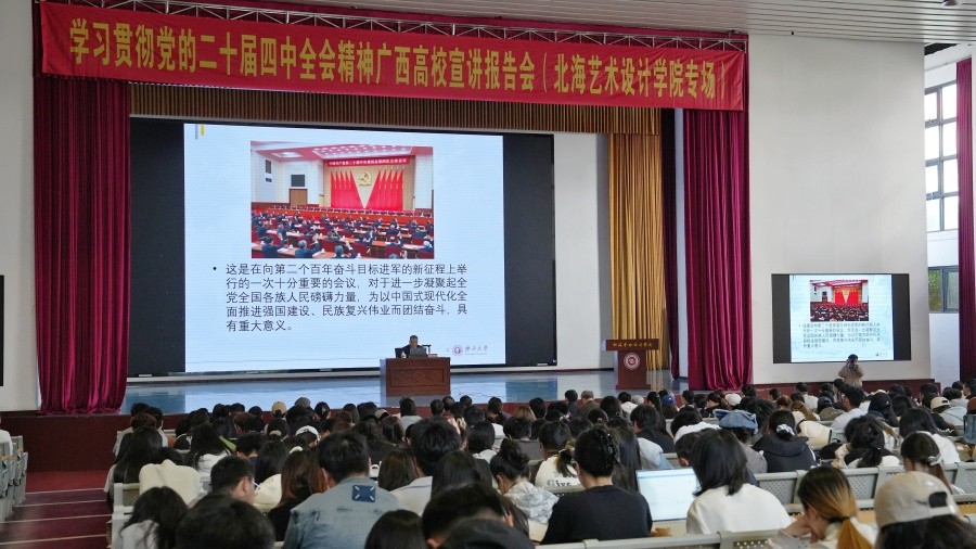 12月9日,学习贯彻党的二十届四中全会精神自治区党委讲师团特聘教授(专家)宣讲报告会(北海艺术设计学院专场)在我校西校区大礼堂举行。自治区党委讲师团特聘教授(专家)、广西大学马克思主义学院教授雷德鹏作宣讲报告。我校党委书记覃宪儒、校长卢新华等在家校领导、中层领导干部、党员、教师与学生代表到场聆听报告会。我校党委副书记刘承初主持报告会。