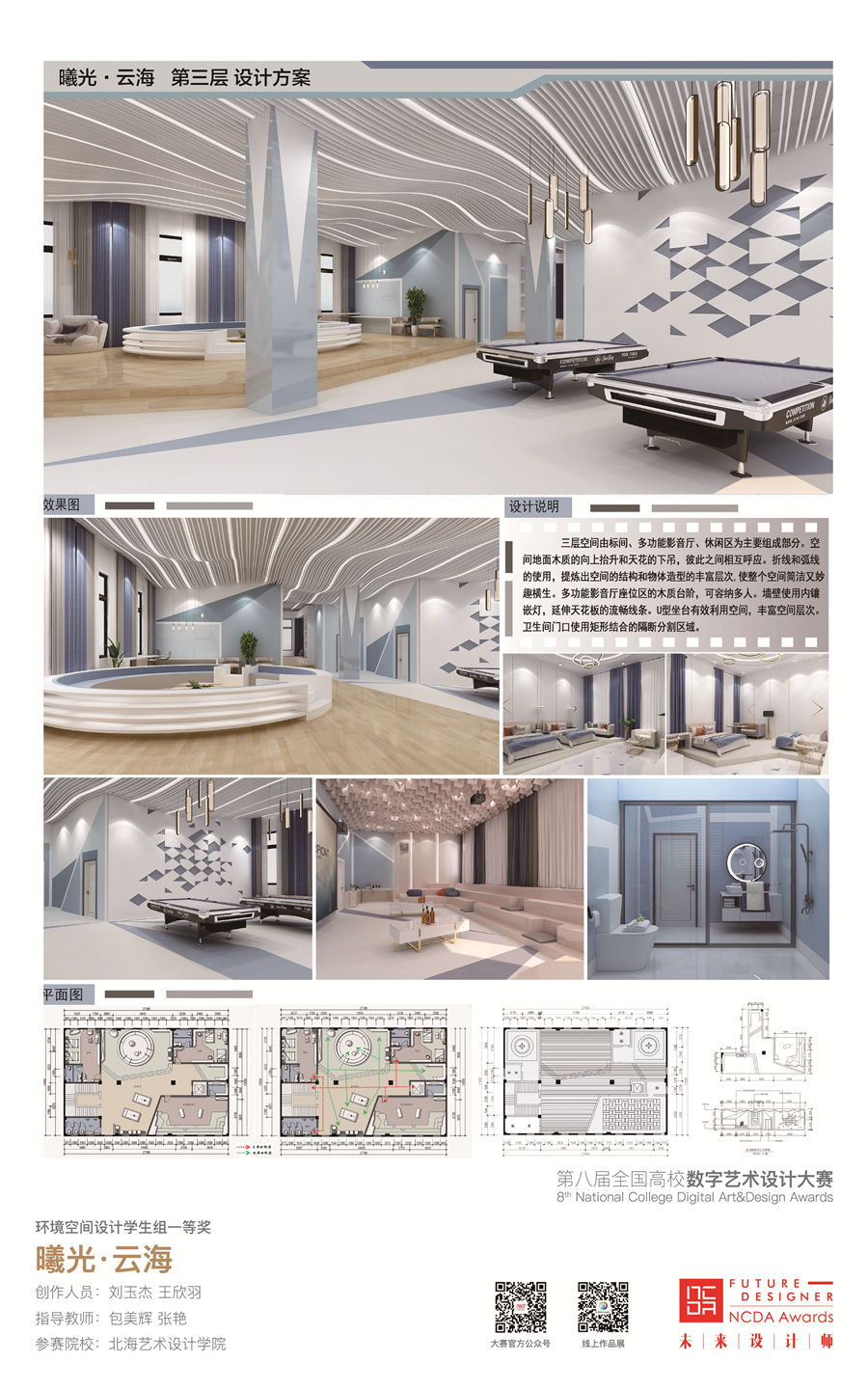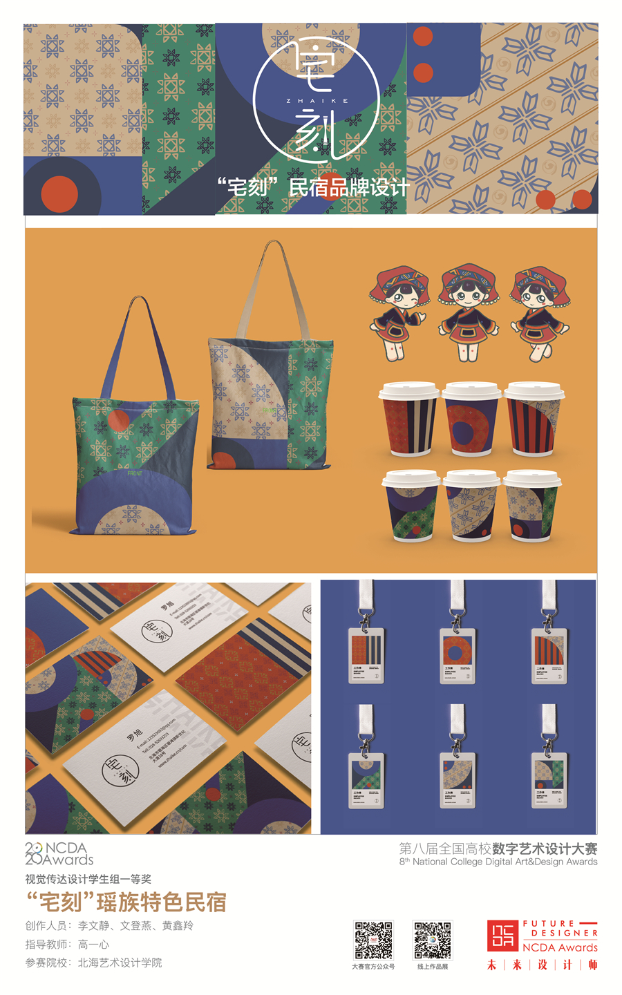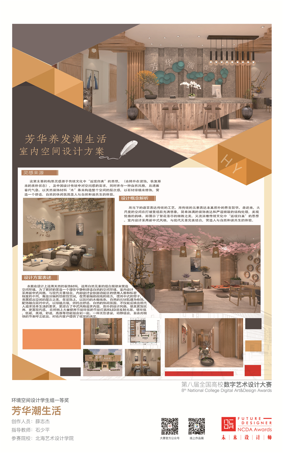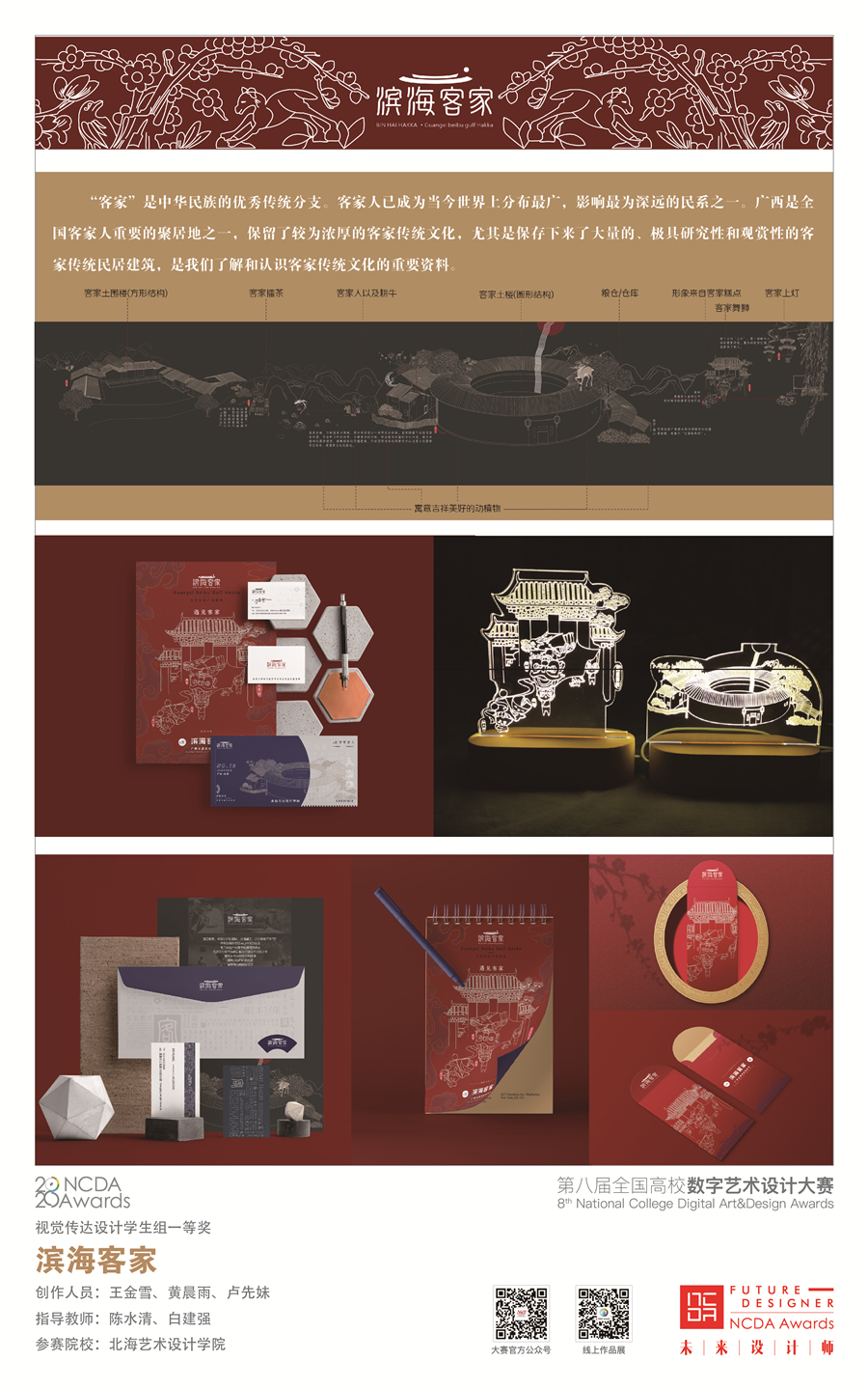 北海艺术设计学院积极组织学生参赛,在本届大赛荣获共全国一等奖4项、二等奖8项、三等奖8项的好成绩,学校荣获卓越贡献奖。其中视觉传达设计学生组一等奖2项,分别是《滨海客家》(作者:王金雪)、《“宅刻”民宿》(作者:李文静  文登燕 黄鑫翎);环境空间设计学生组一等奖2项,分别是《芳华潮生活》(作者:薛志杰)、《曦光·云海》(作者:刘玉杰,王欣羽)。组委会遴选了在本届赛事中获得优异成绩的参赛学校,自2021年4月起,在全国举办优秀作品巡展,北海艺术设计学院被指定为巡展院校之一。