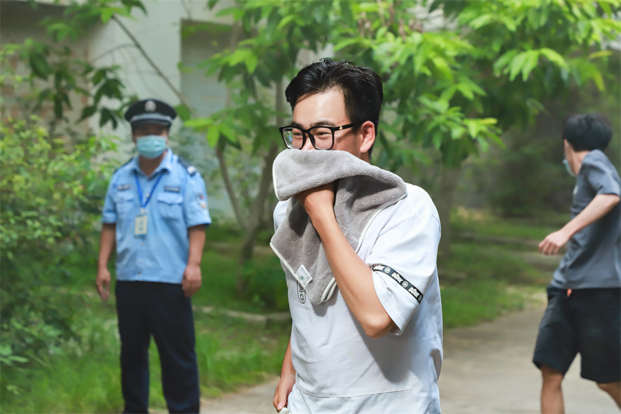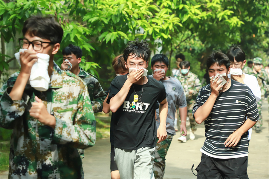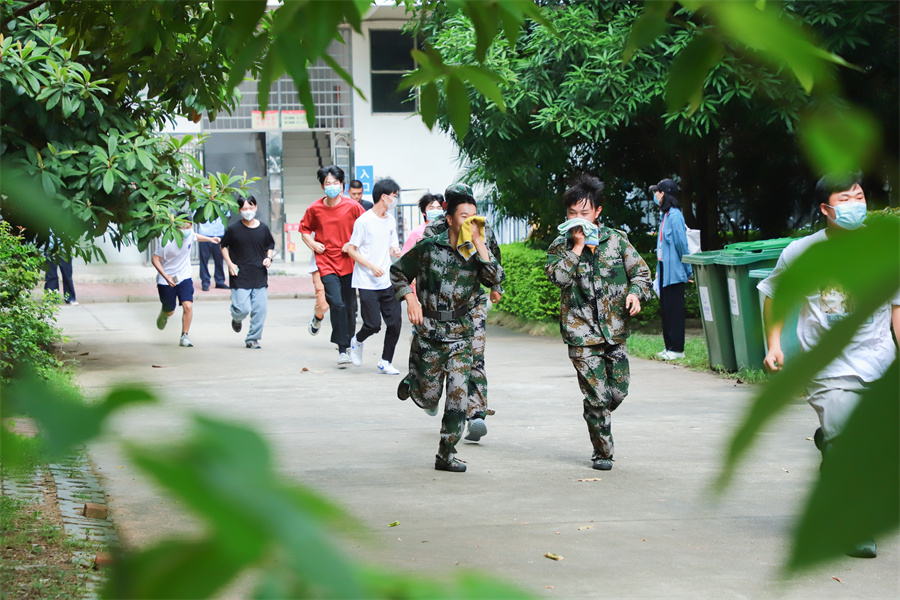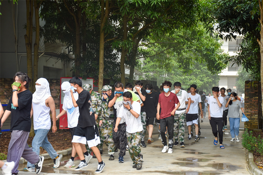 疏散途中,同学们脚步匆忙,神情严肃,但丝毫不见慌乱,以严谨认真的态度对待此次演练。同学们用打湿的毛巾捂紧口鼻,以规范的逃离姿势,低头弯腰,井然有序地快速从宿舍楼撤离。学生到达集合点后,各班教官和辅导员清点本班人数,点评本次紧急疏散集合情况。
