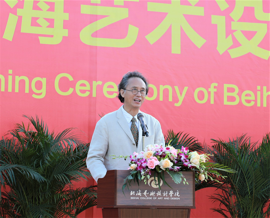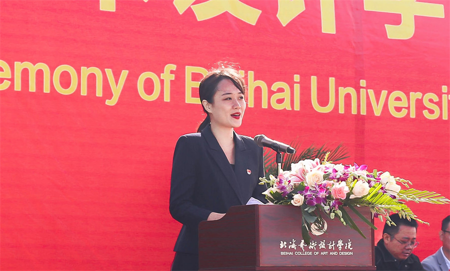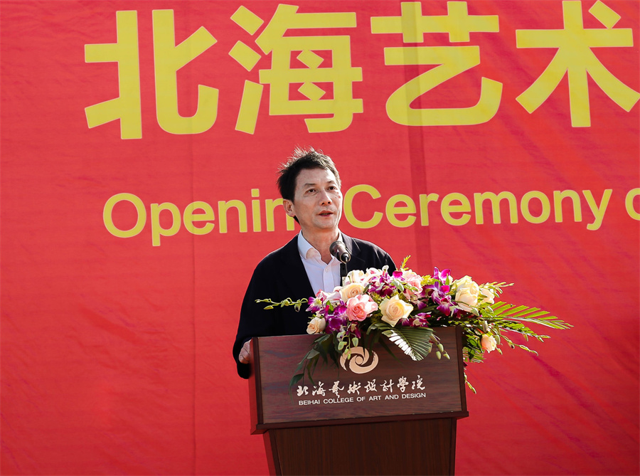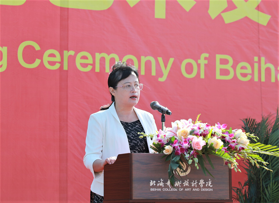 黄毅代表北海市教工委、教育局发表讲话。他说到,北海环境优美,旅游资源得天独厚,经济发展稳中求进、一路向好,北海教育事业蓬勃发展,北海经济社会的发展以及舒适宜人的生态环境,将会为同学们的成长、学习提供良好的环境。北海艺术设计学院经过20载的艰苦磨砺,已经成长为办学理念先进、办学特色鲜明、在北海市有着较高声誉和重要影响的高校,近年来学校上下的齐抓共管、共谋发展,取得了非常好的成绩。学科建设取得重大突破,人才培养质量稳步提高,科技创新工作捷报频传,师资队伍结构不断优化,办学条件明显改善,社会的影响力与日俱增,各项事业呈现出蓬勃向上的良好局面,培养了一大批高素质的专业技术人才,为北海经济社会发展作出了突出贡献。他希望同学们牢记校训,坚定目标,刻苦学习,练就本领;在“海纳百川 追求卓越 创新图强”的城市精神熏陶中,在北艺“德为魂 艺求神”的办学理念引领下,成长为具有丰富知识与过硬本领、爱国情怀和社会责任感、创新精神和实践能力的高素质人才。