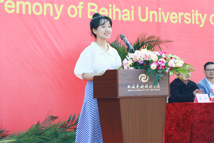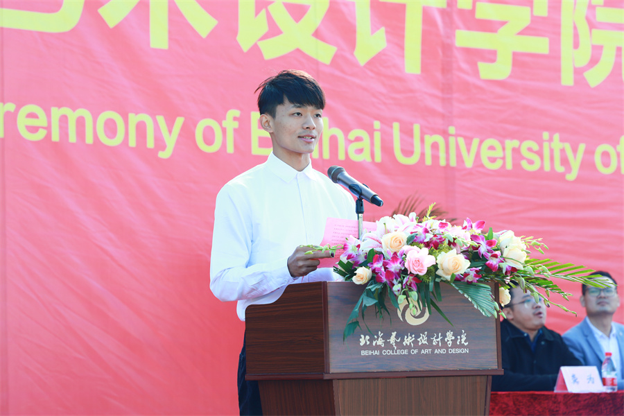 2021级学生陈锘尧向同学们发出号召,立德修身,志存高远,学会包容,博览群书,追求卓越,在北海艺术设计学院书写无愧于时代、无愧于国家、无愧于自己的闪光青春。