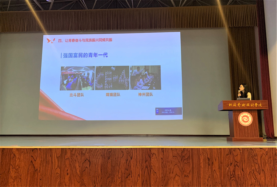 动画与传媒学院党总支书记孙永辉以学院自行创作的动画短片《半条被子》及学院教师带领学院学生团队拍摄的学校首部微电影《唱给海的歌》为切入点,向同学们分享了创作的初衷和拍摄的趣事,以及怎样将红色主题元素融入到具体教学、专业活动、作品内容中,勉励同学们学好专业技能的同时,注重政治理论学习,加强自我修养,关注民生大事,利用自身专业优势当好中国文化、广西发展、北海故事、北艺故事的传播者和讲述人,做有理想有抱负有担当的追梦人。