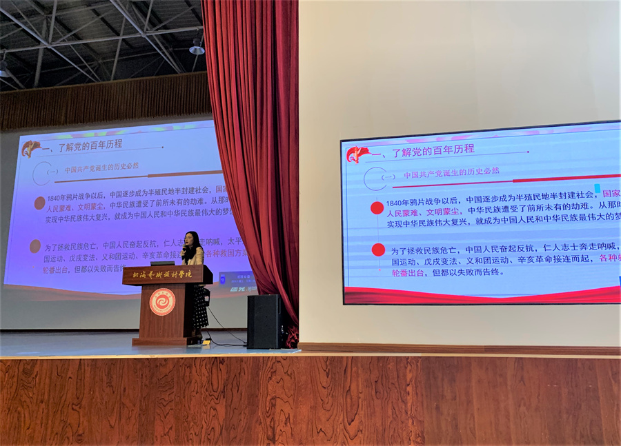 设计艺术学院党总支书记黄锦向同学们深刻讲解了伟大建党精神的内涵、历史地位及具体体现,鼓励同学们加强学习领会习近平总书记关于伟大建党精神的重要论述,深入把握伟大建党精神的核心要义和实践要求,继续弘扬光荣传统,赓续红色血脉,从中汲取新时代中国共产党人奋进的强大力量。