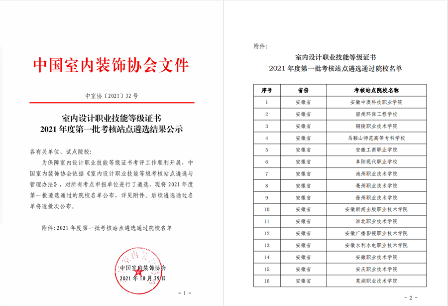 2021年10月我校建筑与环境艺术学院被遴选为全国1+X室内设计职业技能等级证书2021年度第一批考核站点。为落实相关工作安排,我校选派两位教师参加由中国室内装饰协会主办2021年度全国室内设计1+X职业技能等级证书师资及考评员培训(广西站),并通过师资及考评员考核。