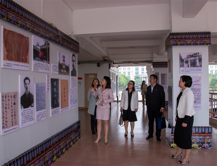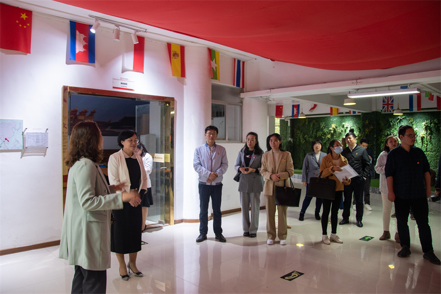 会前,张阳一行参观了该校红色广西——党性教育主题室暨爱国主义教育基地、课程思政(国际语言)实践基地、全媒体交互式跨专业语言应用中心、校展馆、四史馆、教师发展中心。