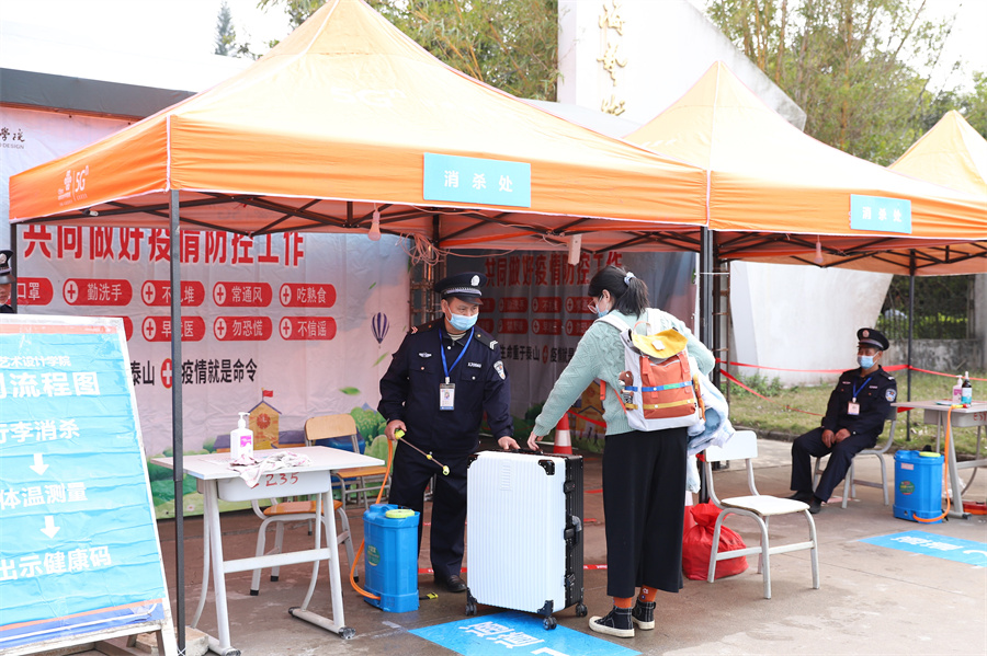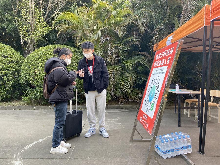 学生报到前,学校针对学生的健康状况、行动轨迹、假期居住地风险等级、个人疫苗接种等情况进行了全面的排查,确保每一位返校学生的健康安全。返校期间,按照疫情常态化防控要求,保安人员对返校学生行李进行严格消毒,核验通信大数据行程卡、健康绿码无异常后,学生通过防疫测温通道进入接待区域,接待点老师核对学生的个人身份信息、检查48小时内核酸检测阴性报告单。在相关部门的有序组织下,整个报到返校流程井然有序,方便快捷。同时设立发热等异常情况门诊复查点和临时隔离点、配备好防疫相关物资。