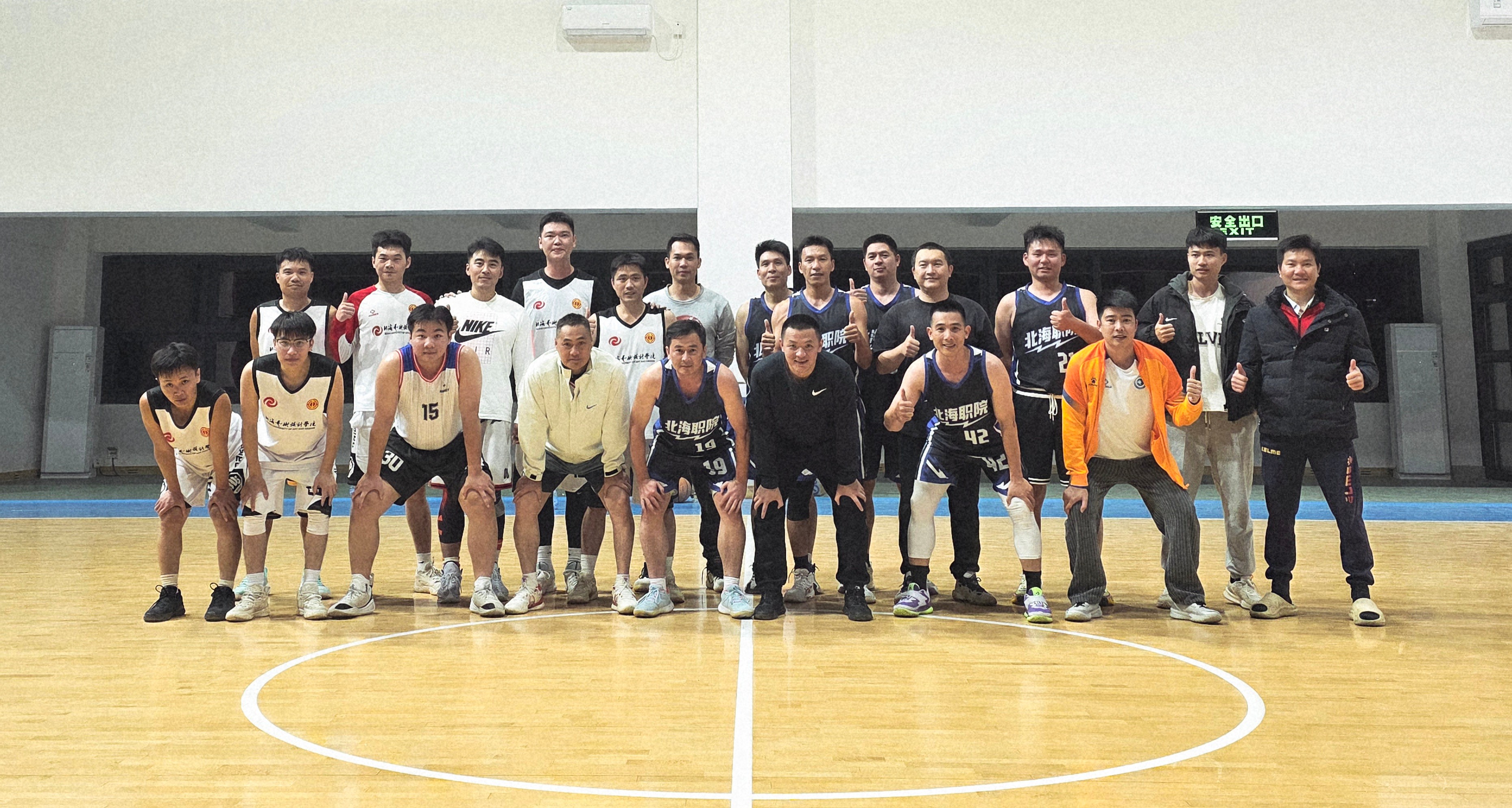 2025年12月25日,北海艺术设计学院工会组织教职工代表队与北海市职业学院在我校南校区篮球馆举行篮球友谊赛。本次比赛旨在推动两校教职工交流互动,激发团队协作精神,营造积极健康的校园文化氛围。