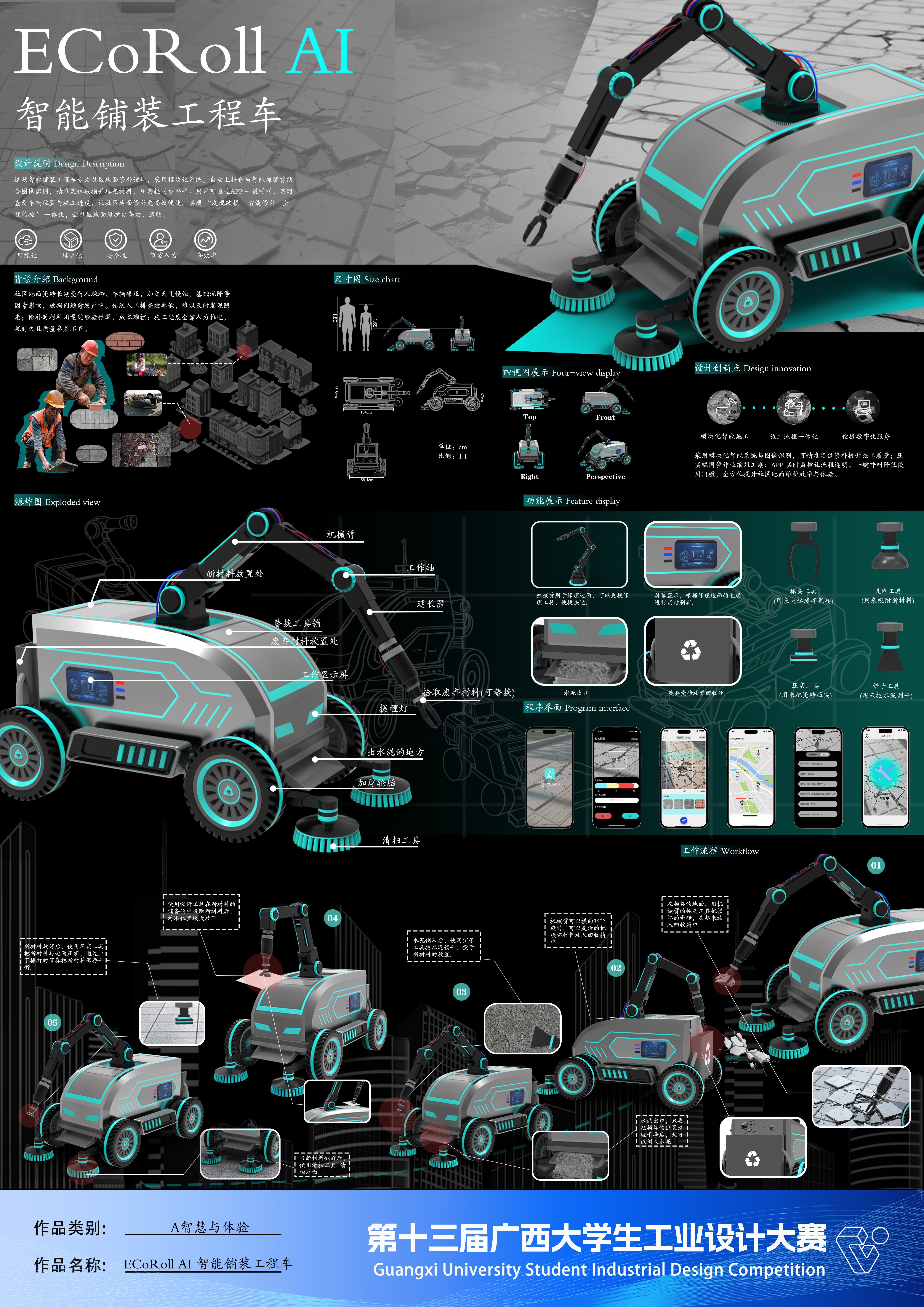 作品名称:ECoRoll AI——智能铺装工程车    作者:李诞、刘雨佳、李佳、熊晓渝、刘轩