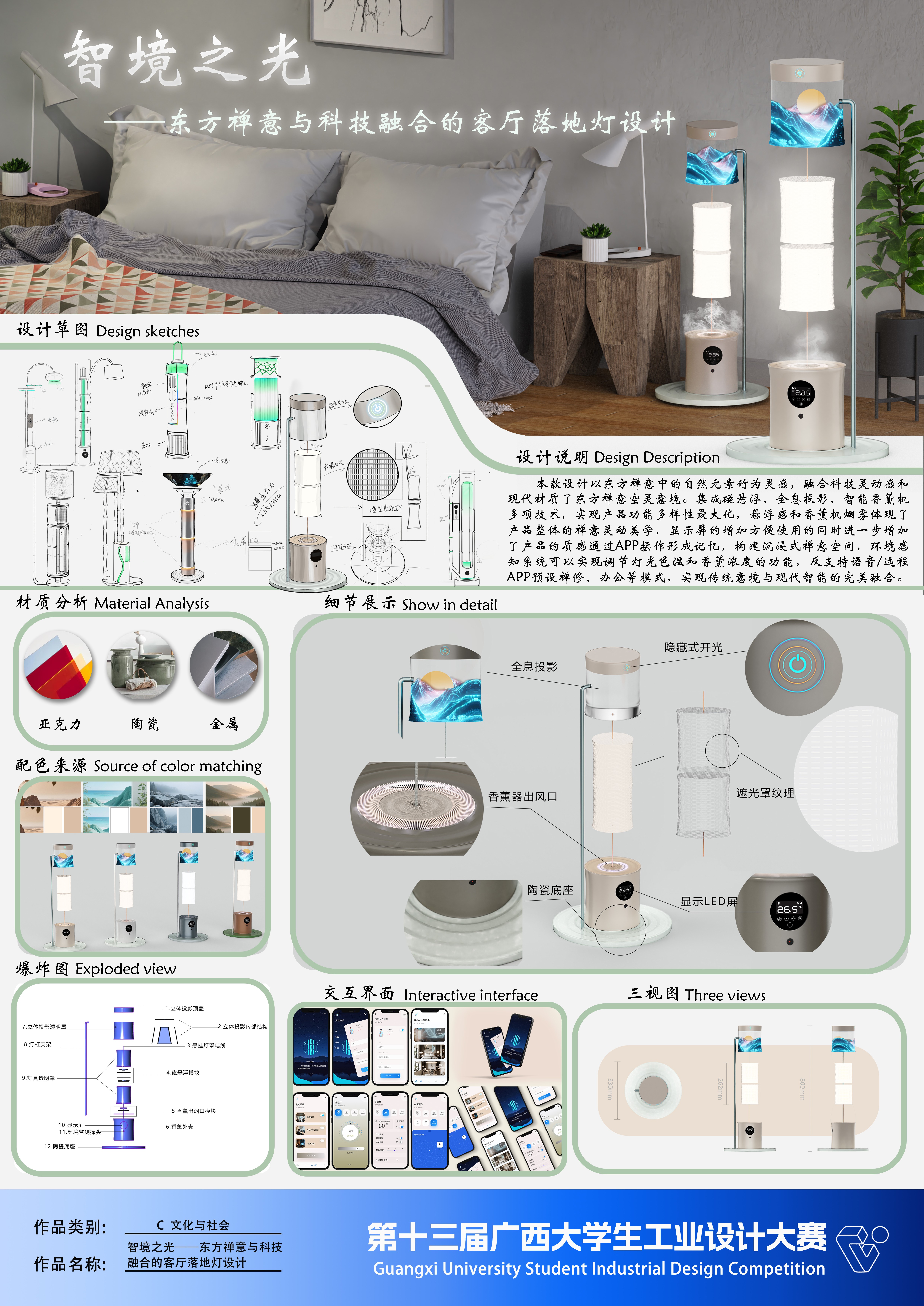 作品名称:智境之光——东方禅意与科技融合的客厅落地灯设计  作者:黄堪猛、姬亚楠