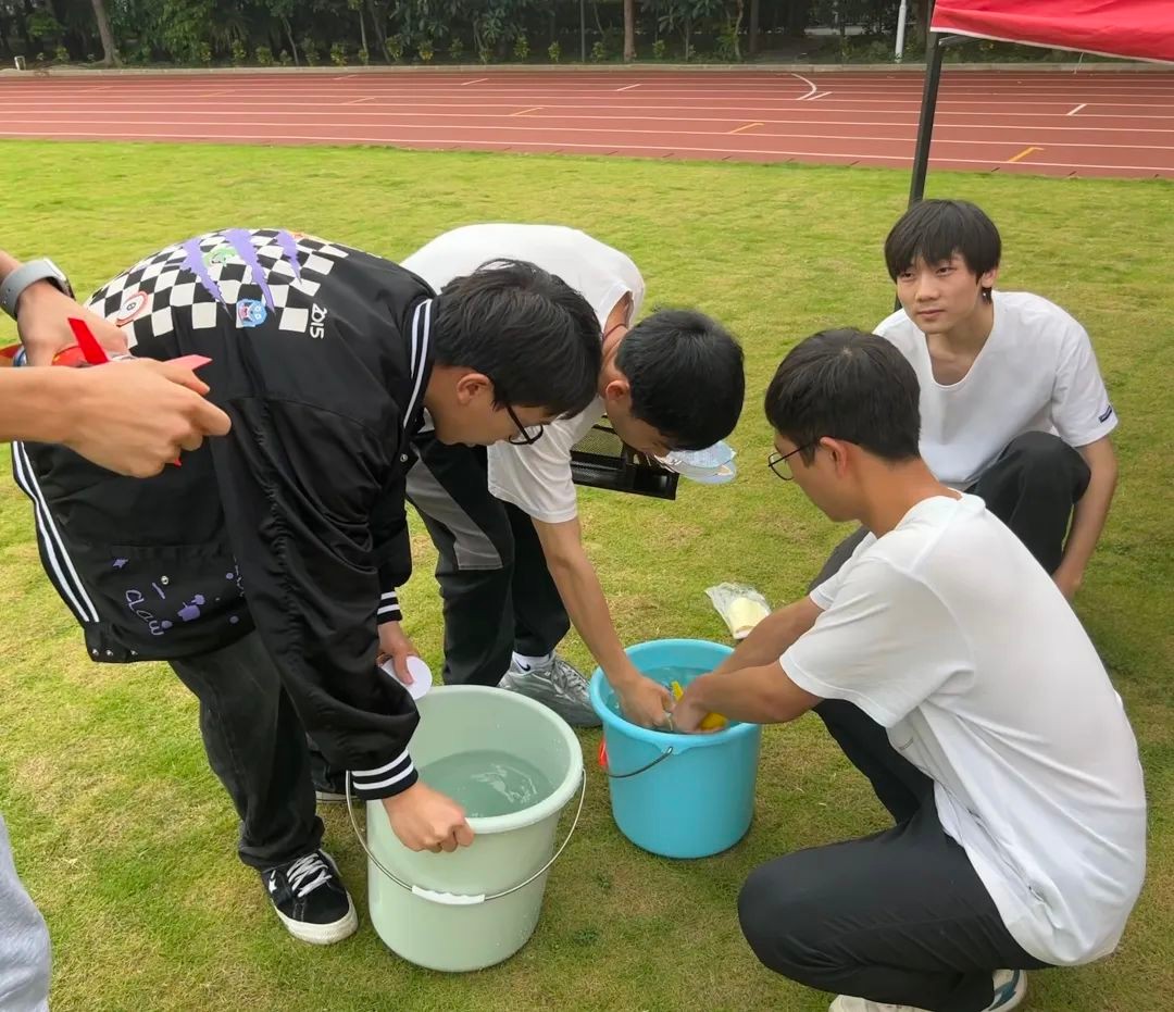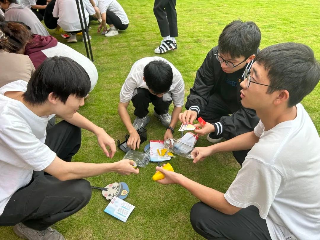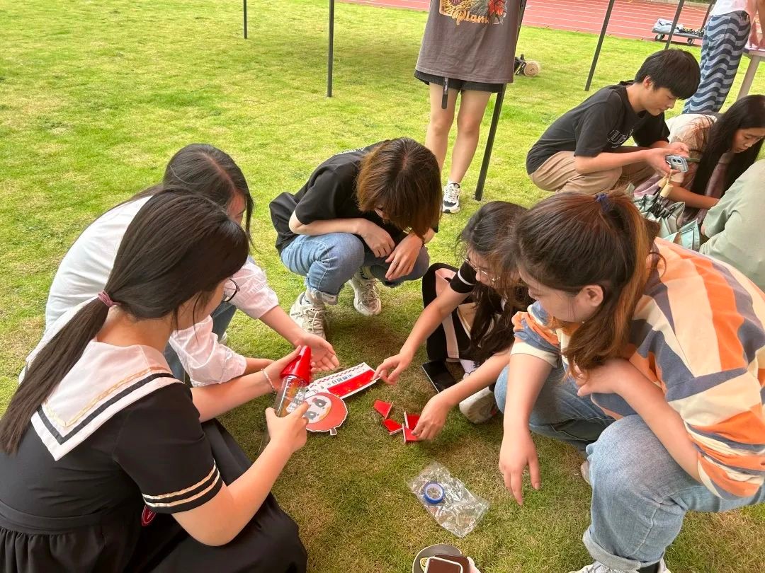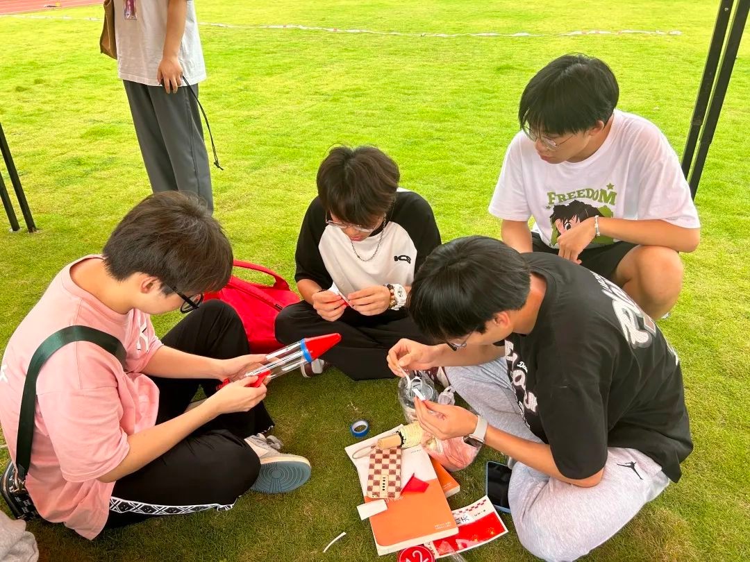 首先进行的是限时八分钟的水火箭组装赛。面对兼具挑战性和趣味性的组装考验,各个小组都能从容不迫地应对。在经过紧张的组装环节,一个个水火箭有了雏形,每个小组水火箭都被装饰得形式各异、精致美观,充分体现了各个小组的个性与追求。