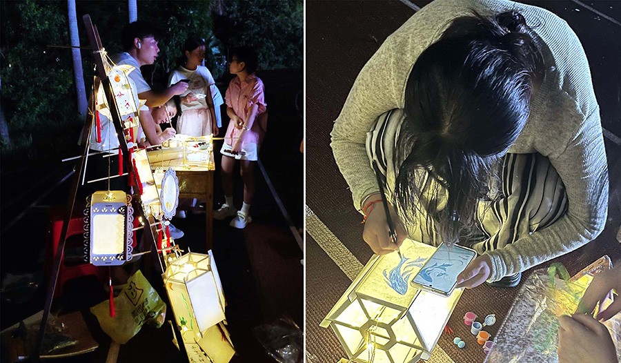 傍晚时分,学院分团委干事们在运动场布置好了活动点位,摆放的DIY灯笼随即吸引了众多路过师生的目光,大家积极参与到手工灯笼制作的活动中来。同学们在剪、贴、涂等制作过程中相互交流和沟通,呈现出祥和、活跃的节日氛围,随着各种创意灯笼的纷纷出炉,展示出我校学子不凡的动手能力和文艺修养。工作人员也始终活力满满,耐心为师生们做好服务。