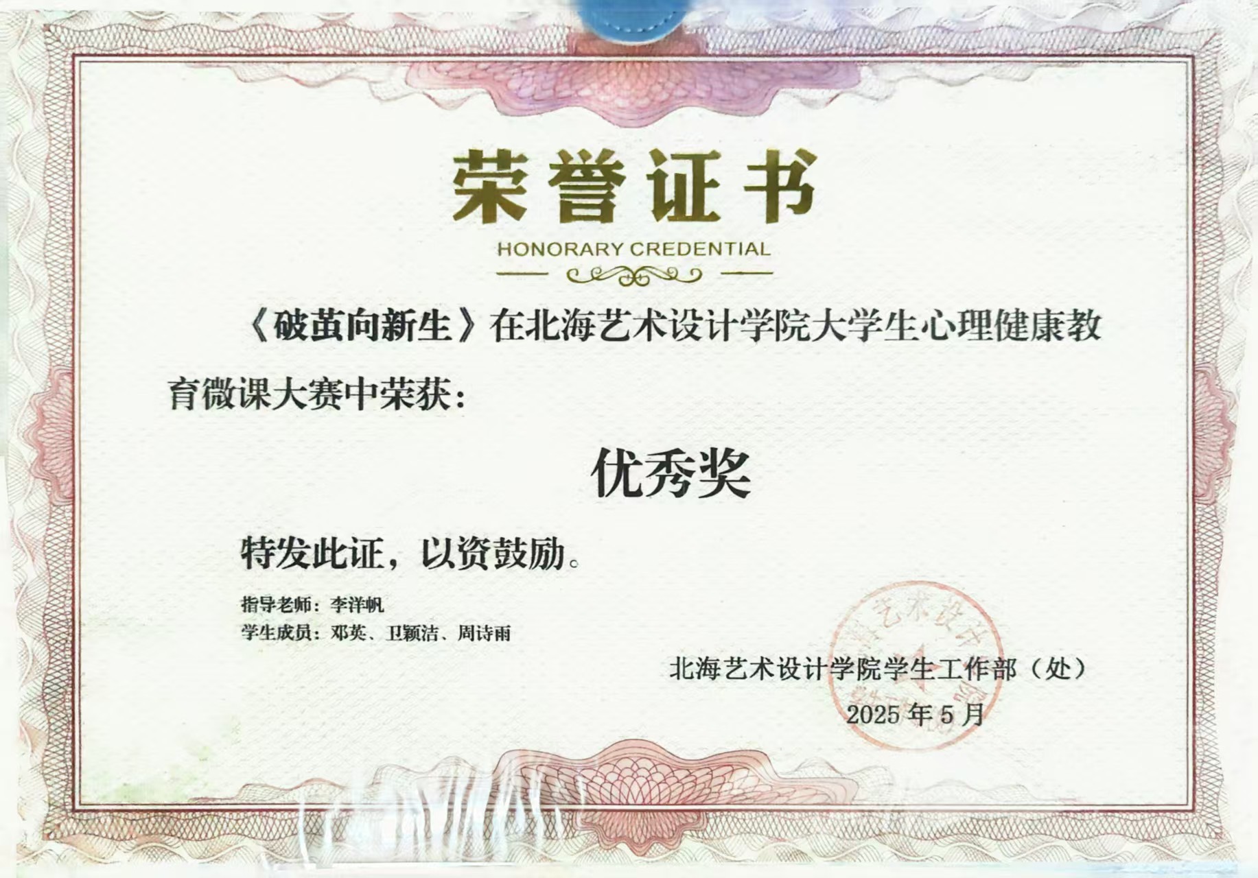 2025年5月 参与的微课《破茧向新生》北海艺术设计学院大学生心理健康教育微课大赛中获优秀奖;