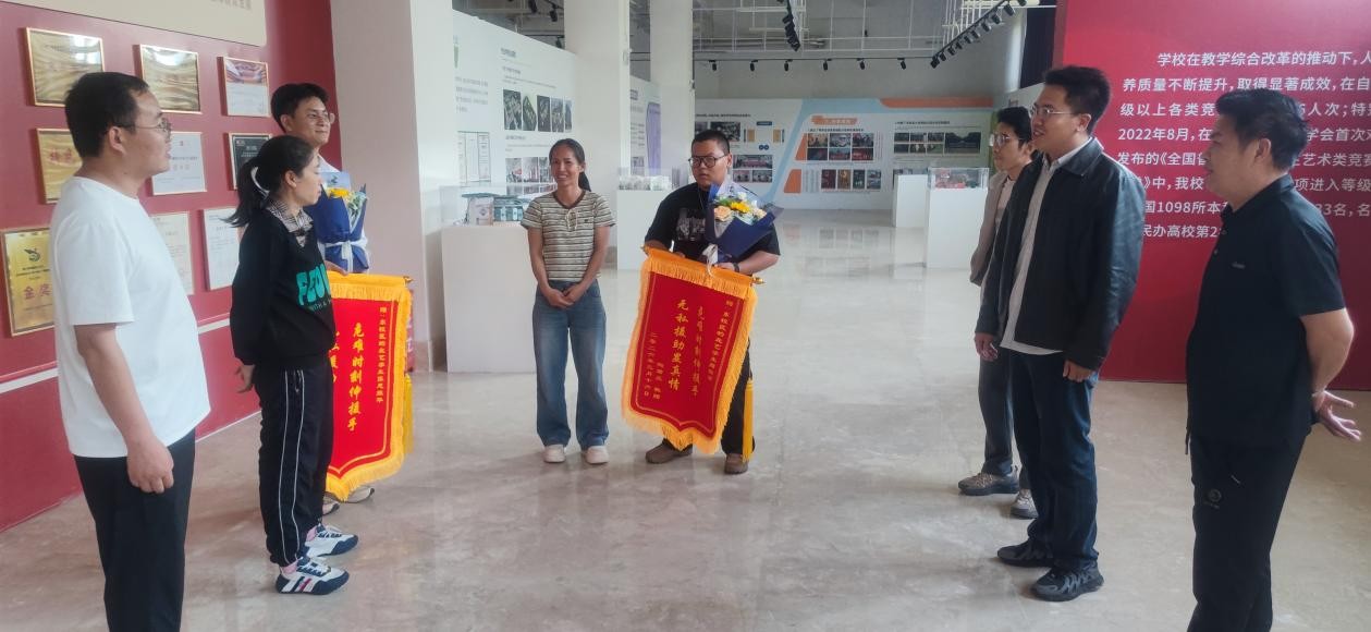 传媒艺术学院领导、美术学院领导和感谢家长与见义勇为学生合影