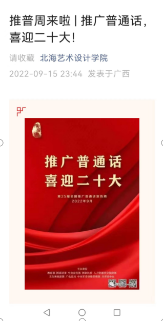 一轮集中宣传:各二级学院紧紧围绕推普周活动主题,通过积极组织多种多样的线上线下宣传活动,如:宣传栏、校园广播、主题展板、微信公众号等,为党的二十大召开营造浓厚氛围,推动形成亲近中华经典、热爱祖国语言文字、自觉提升语言文字规范意识和应用水平的良好氛围。