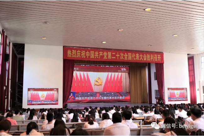 10月16日上午10点整,中国共产党第二十次全国代表大会在北京人民大会堂隆重开幕,中共中央总书记、国家主席、中央军委主席习近平代表第十九届中央委员会向大会作报告。学校党政领导班子、全体中层领导干部、党员代表、入党积极分子和学生干部1000余人在学校主会场大礼堂和分会场伦理楼107教室集体收看大会实况。其他师生通过电视、网络、广播、手机客户端等多种形式收听收看大会开幕会现场直播盛况,第一时间学习领会大会精神。