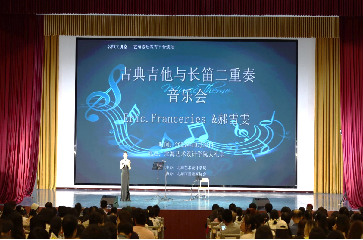 10月26日晚,北海艺术设计学院客座教授旅法长笛演奏家郝雪雯女士和古典吉他演奏家埃瑞克·弗朗塞利(Eric Franceries)先生我校西校区大礼堂带来了一场精妙绝伦的《古典吉他与长笛二重奏》音乐会。我校及社会各界领导嘉宾与我校广大师生、北海市民一起观看了演出音乐会由人文教育学院教师卢尚蕊主持。