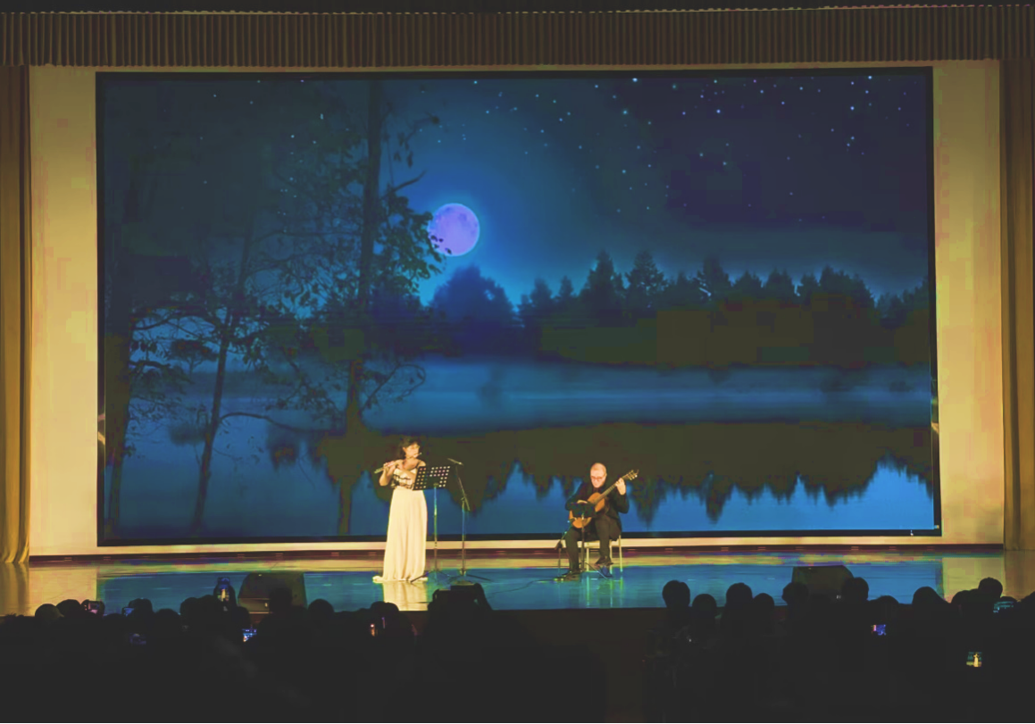 音乐会开场,两位演奏家首先为大家带来长笛吉他二重奏《夜曲》,从开始部分梦幻般的优美主题旋律,到中部的舒缓宁静,到再现部的优美抒情,经过两位演奏家演绎的二重奏夜曲,以迷人的音乐语言和多变的创作手法体现出一种极富诗意的创作风格,使现场观众沉醉其中。