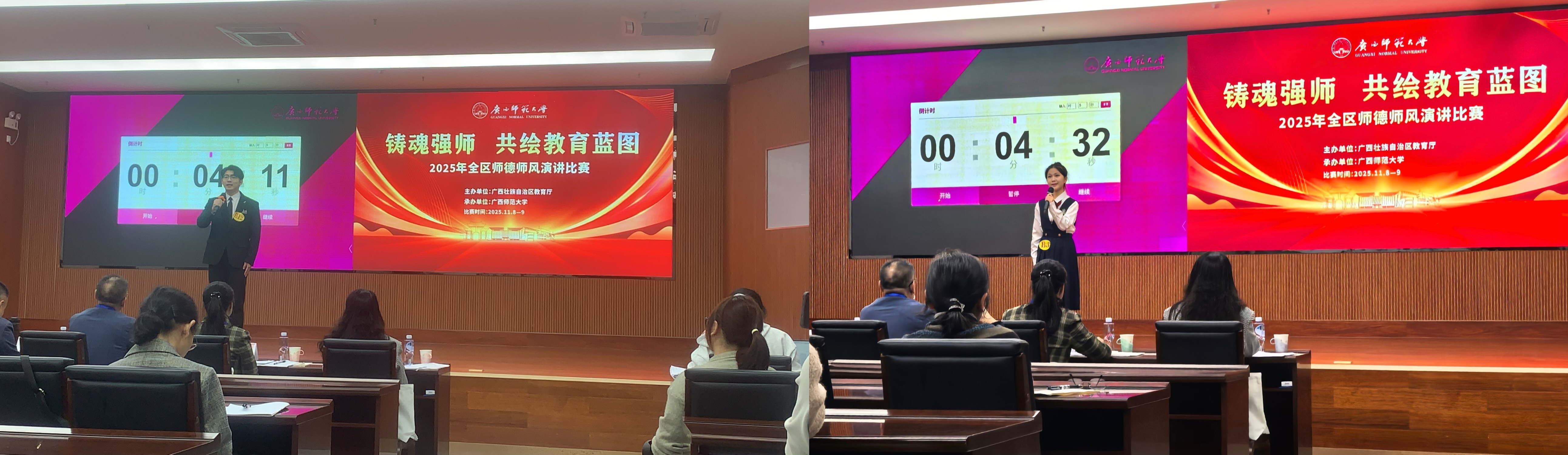 2025年11月8日至9日,由广西壮族自治区教育厅主办的以“铸魂强师,共绘教育蓝图”为主题的2025年全区师德师风演讲比赛在广西师范大学育才校区成功举行。教育学院学前教育专业两名学生参赛,经过激烈角逐,丁朝旭同学凭借出色表现荣获高校师范生组二等奖(排名第一),充分展现了我校学子扎实的专业素养与卓越风采。