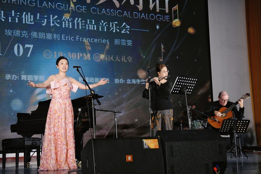 由北海艺术设计学院主办,舞蹈学院、教育学院及影视动画学院联合承办,北海市音乐家协会协办的 风吟弦语古典对话古典乐盛宴,于 2025 年 11 月 7 日在学校西区大礼堂温情上演。法国古典吉他演奏家埃瑞克·佛朗塞利与旅法长笛演奏家郝雪雯联袂登台,学校常务副校长胡胜、副校长邱杰、总督学王斌师生代表及社会各界嘉宾齐聚现场,沉浸式领略这场兼具专业厚度与艺术感染力的听觉盛宴。