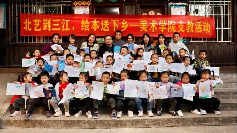 2023年3月9日,龚为教授、张云杰教授、肖玺副院长、鲁明阳副书记、郭刚老师前往三江蓝精灵幼儿园为孩子们送去绘本。老师们在写生前了解到地方幼儿绘画教育资源匮乏,挑选出优秀的学生绘本作业制作成绘画图书,并安排学生为大班的孩子们讲授一堂绘画课程。