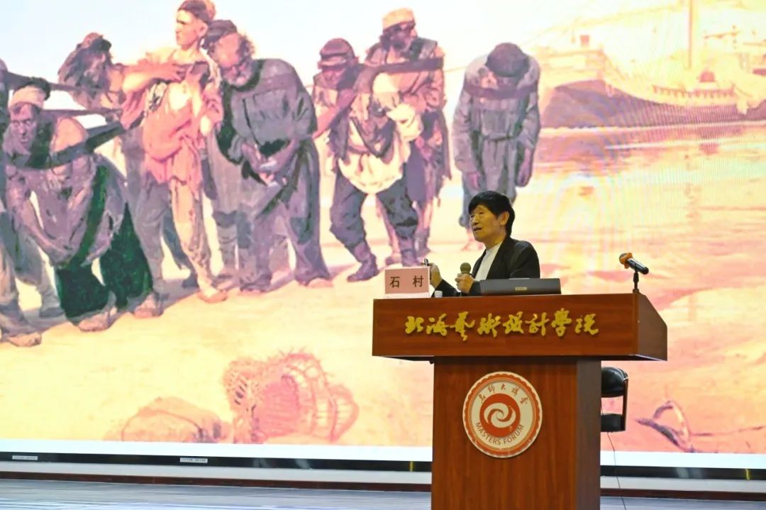 紧接着,石村教授指出主题性美术创作最主要的方法就是明确:艺术源于生活,但高于生活。因此平时要注意观察生活,在身边日常中汲取灵感,但要从生活上升到艺术层面,就要有表达积极向上的主题。同时,石村教授表示主题性美术创作的特征是从生活中取材,主题表达含蓄,所以大家要积极探索造型手法,学会运用寓意和象征来深化主题表达。