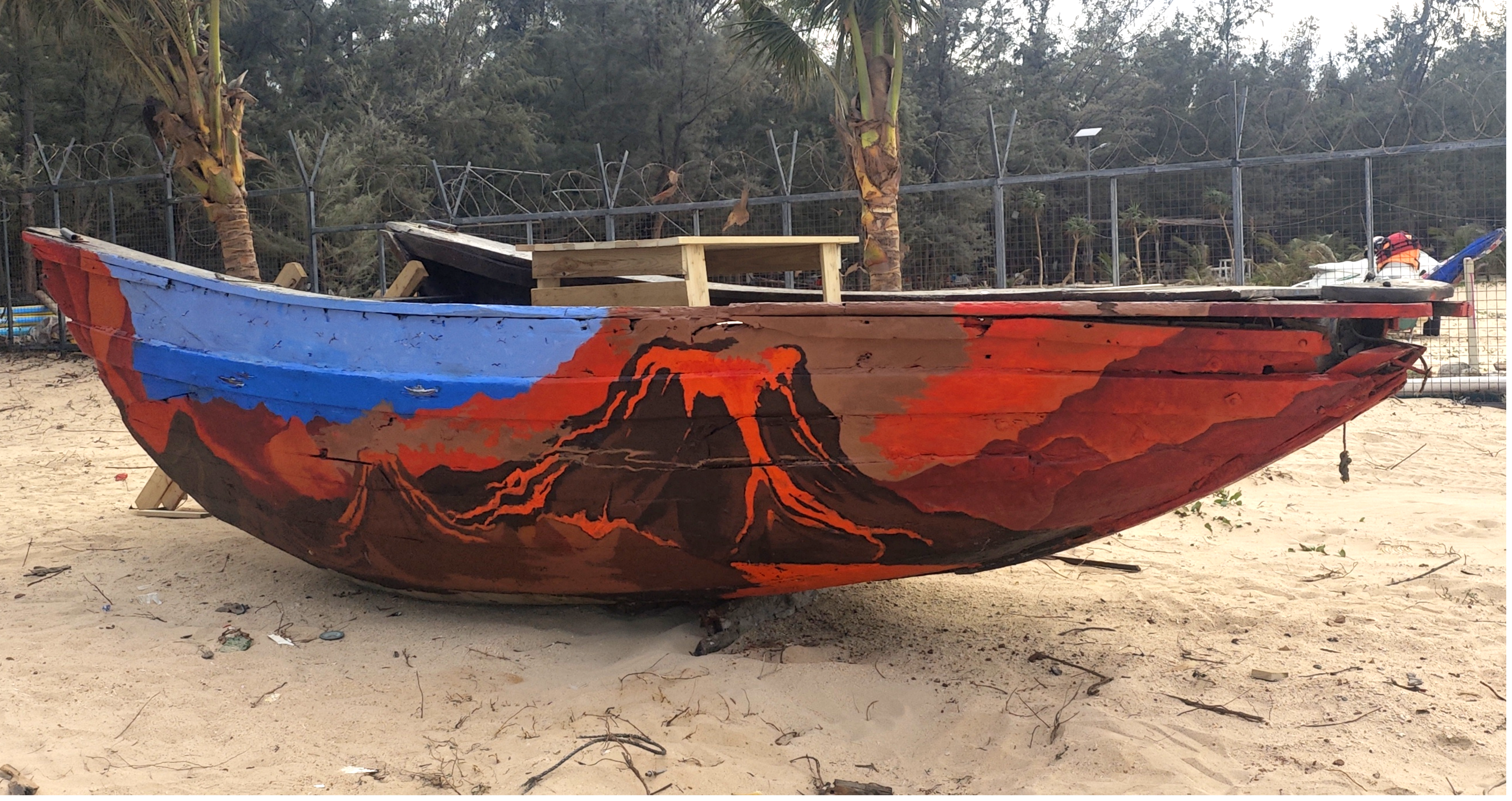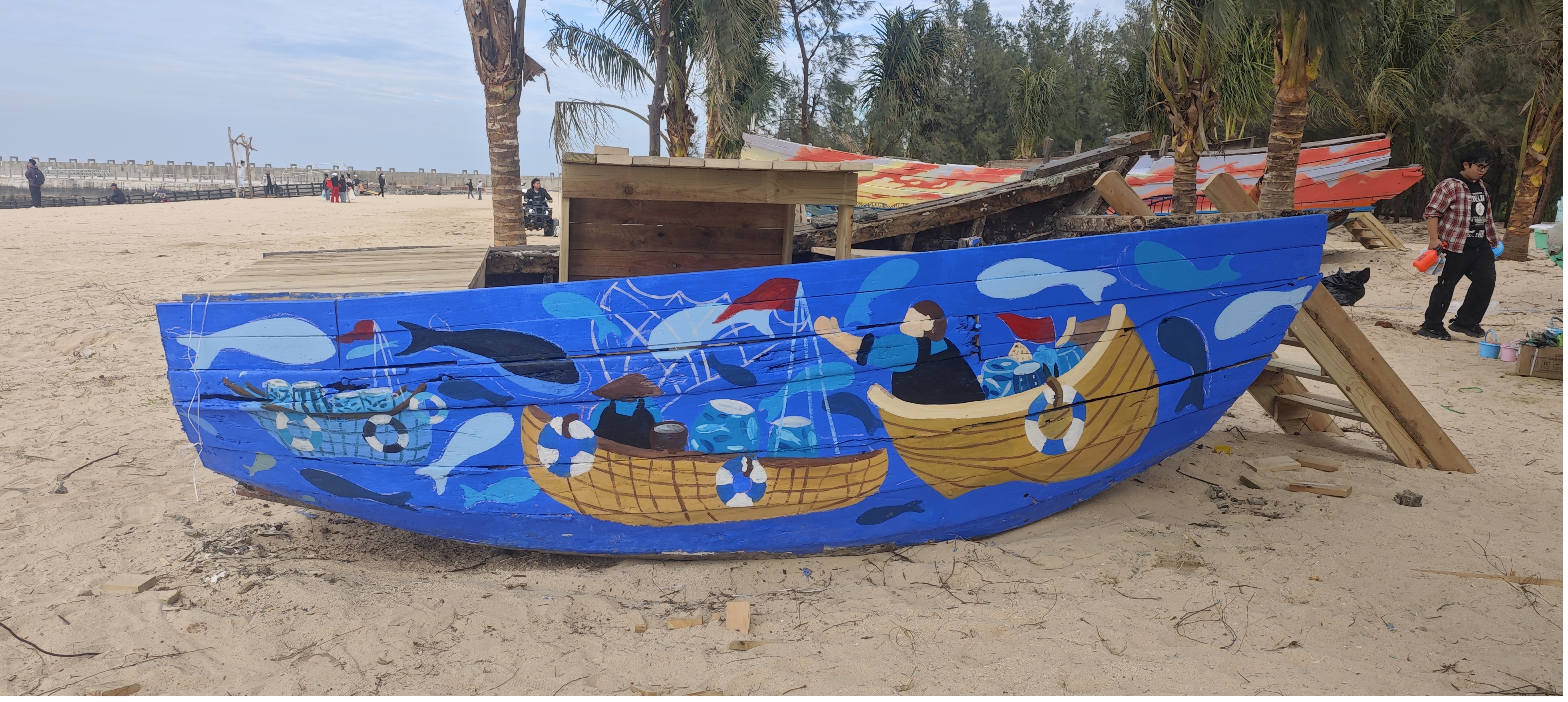 经过7日艰苦奋斗,于11月21日晚顺利完成所有船体彩绘,并于22日上午平安返校。期间,团队成员面临多种困难挑战,天气骤然降温十四摄氏度、海边6-7级大风、多名师生感冒发高烧等等。令人为之深深动容的是,没有一位同学轻言放弃。全体师生秉持对艺术品质的执着,将压力化为动力,始终坚守艺术标准与工期进度。他们日出而作,戴月轮班,硬是在船体破损晃动、画具被风吹洒、颜料凝固大量海沙等不利条件下,师生以雨衣系身进行保温措施,借助头灯补光完成细节刻画,将每一处细节都刻画得一丝不苟。同学们将课堂所学灵活运用于真实场域,这份在风浪中坚守的专业精神,是任何课堂教学都无法替代的宝贵成长。最终九艘渔船均高质量呈现主题彩绘,获得涠洲岛管委会书面社会服务表彰,为学校赢得良好社会声誉。