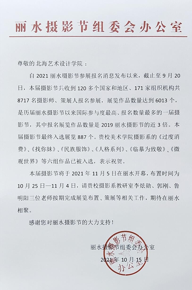 美术学院在丽水摄影节活动中荣获佳绩。摄影系2018级学生的《过度消费》(作者:李淑慧)、《找你妹》(作者:崔娟)、《临摹为致敬》(作者:高锐)、《微观世界》(作者:卓中广、彭呈辰、吴建平)、《民族服饰》(作者:曹秋艳)、《人格系列》(作者:张一凡)六组学生作品已被入选。