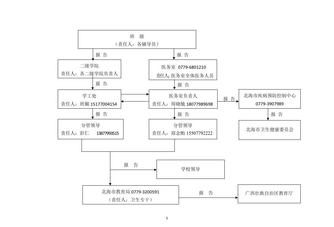 (五)学校各部门发现传染性疫情和公共卫生突发事件时,应于第一时间报告给医务室,医务室按规定处置并配合北海市疾病预防控制中心专业人员进行调查、采样、消毒和处理。