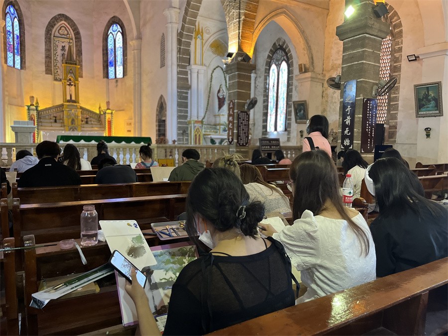 在此次涠洲岛综合实践活动中,设计艺术学院师生们先后到达涠洲岛天主教堂、码头、火山口公园进行风景写生实践教学。学生用手中的画笔共同记录下涠洲岛的自然美景与人文景观,与此同时加深对涠洲岛特色民俗风情与历史渊源的了解与认识,领悟户外写生的意义,从而更好地进行创作。