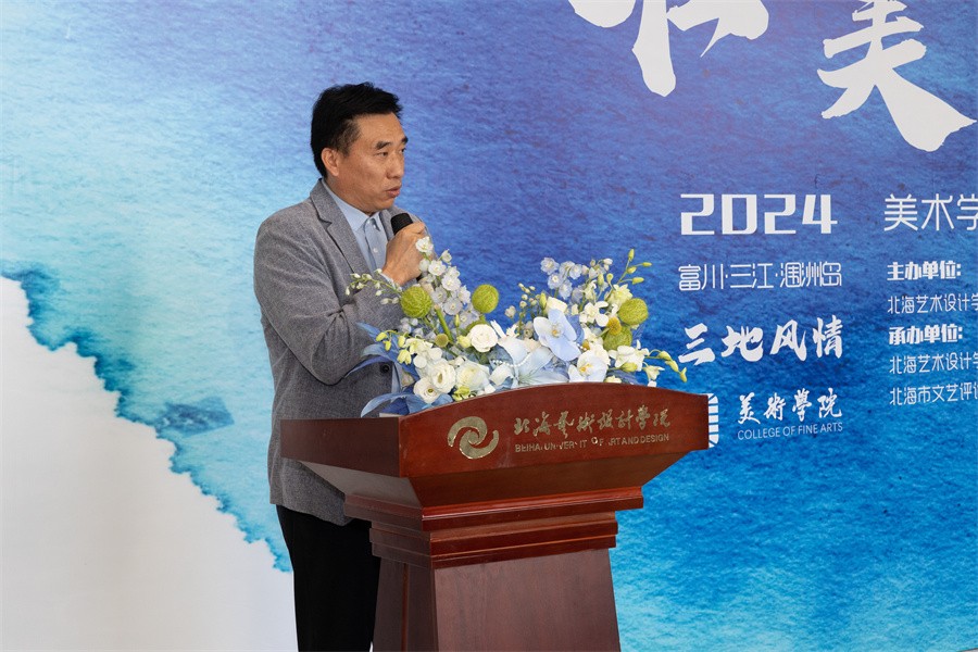 12月31日下午,由北海艺术设计学院主办,美术学院与北海市文艺评论家协会共同承办的“壮美广西·三地风情——美术学院2024风景写生展”在学校展厅9楼(北)开幕。原中央美术学院党委副书记、北海艺术设计学院特聘教授、展览学术主持王少军,北海艺术设计学院特聘教授、艺术家、收藏家何二民,北海艺术设计学院特聘教授、一级美术师、美术学院肖畅恒,北海艺术设计学院特聘教授、北海市画院院长、北海市美术家协会主席蔡群徽,北海艺术设计学院特聘教授、雕塑家刘峰,北海市收藏研究会会长游刘清东等艺术界知名人士,我校党委书记覃宪儒,校长卢新华,常务副校长胡胜,副校长陶立阳、包建明,动画与传媒学院院长孙永辉,美术学院党总支书记韩玮,执行院长龚为,副书记鲁明阳,副院长金凯婧、肖玺、殷声出席开幕式,美术学专业带头人唐海等学院领导、教授以及美术学院各教研室主任、副主任、专业教师参加开幕式。开幕式由美术学教研室教师李洋帆主持。