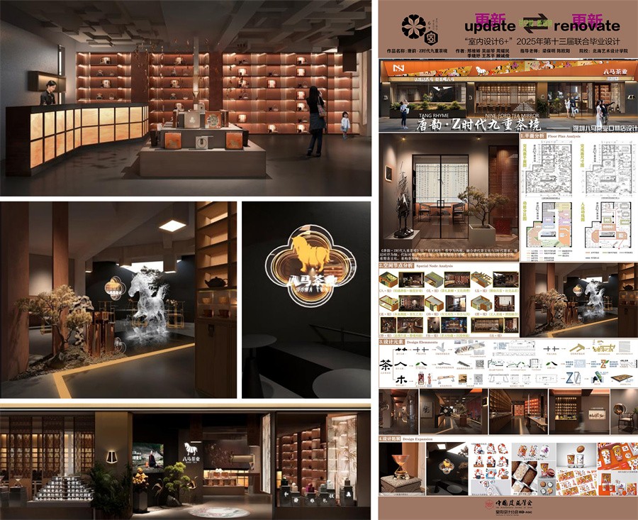 此次联合毕业设计共有13支学生代表队进行了实题实做的创意方案展示。我校建筑与环境艺术学院2022级6名学生在教师梁保明、陈欧阳的指导下,历经半年打磨的作品《唐韵·Z时代九重茶境》以“有无相生”哲学为内核,融合唐代茶文化与Z时代需求,通过时序为轴、代际对话、时空之旅、九重茶境四大逻辑,打造虚实交融的沉浸式茶空间。从实地考察到方案制作再到实验探索以及最后的方案呈现,每一步都体现了建筑与环境艺术学院科学严谨的设计思路和团队协作的智慧。